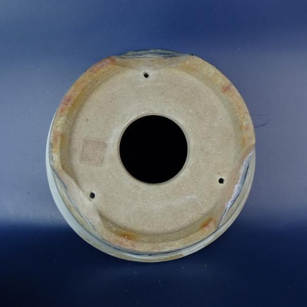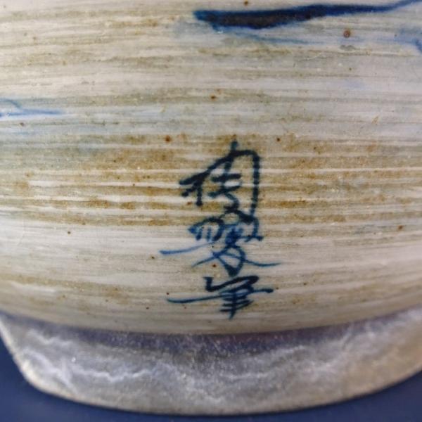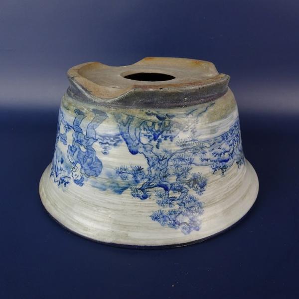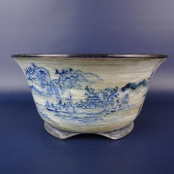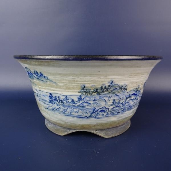 Used Tosui bonsai pot, small, approximately 18.5cm long, round pot with blue and white porcelain, featuring a figure and pine tree, landscape painting, original condition.
