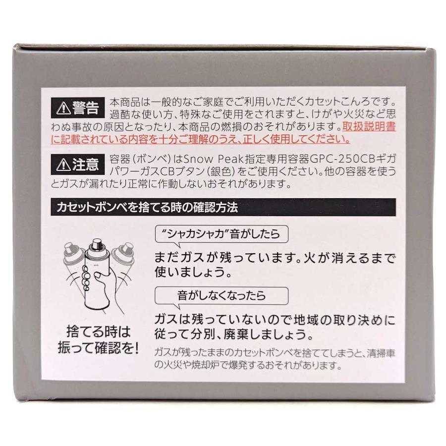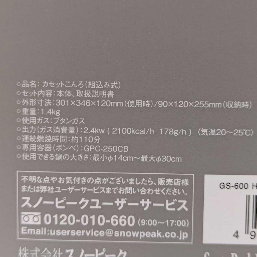 [タイプ] HOME&CAMP バーナー[型番] GS-600KH[重量] 1.4kg[カラー] カーキ[サイズ] 346×301×120(h)mm[素材] ステンレス、スチール、アルミニウム合金、ブラス、樹脂、ゴム[PSマークの種類] PSLPGマーク[届出事業者名] 株式会社スノーピーク[登録検査機関] JIA 一般財団法人 日本ガス機器検査協会[状態] 未使用品(箱に少し傷みがみられます。)[詳細備考] 対応鍋径:最小Φ14cm~最大Φ30cm/ダッチオーブン使用不可専用容器(ボンベ):GPC-250CB連続燃焼時間:約110分出力(ガス消費量):2.4kw(2100kcal/h178g/h)〈気温20~25℃〉