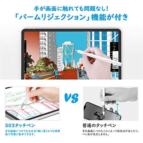 【パームリジェクション機能を搭載】:?従来のタッチペンをご利用している際には、手を浮かせて入力を必要があり、負担が生じたり書きやすさが低下します。弊社のこのS03タッチペンは、Apple Pencil純正品のようなパームリジェクション機能を搭載しており、手がiPad画面と接触しても、接触部位は認識せずにスタイラスの先端部で触れた位置のみを検出されます。紙にペンで文字を書くのと同じように入力することが可能となりますので、作業スピードが向上し、身体への負担感も軽減されます。