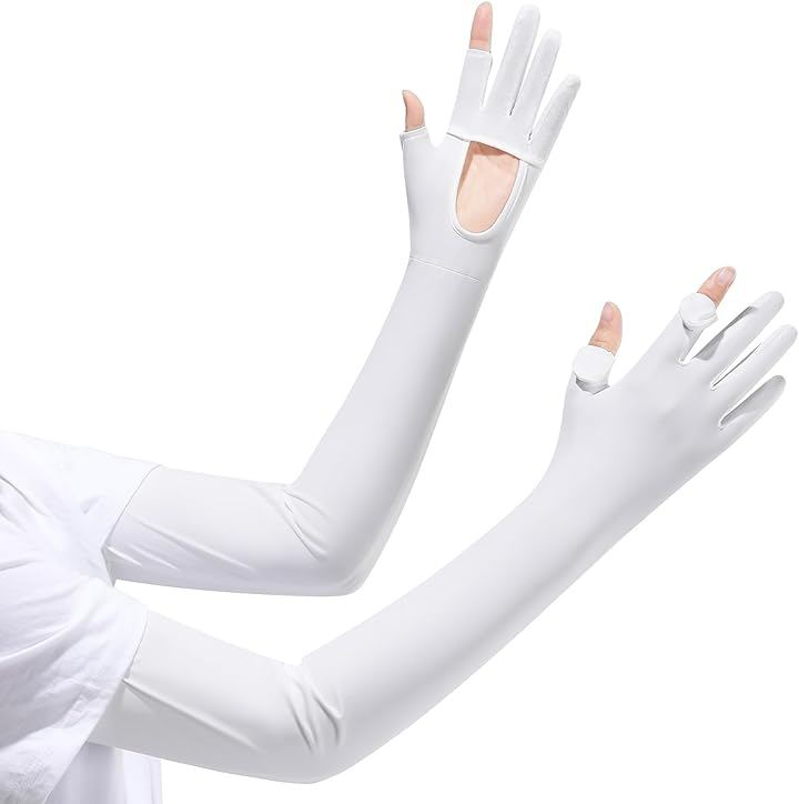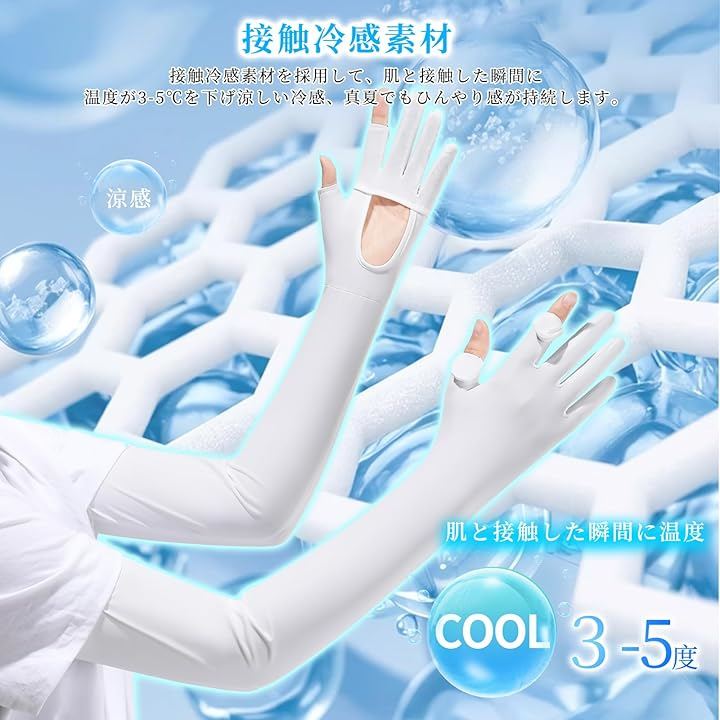 UV-cut arm sleeves with palm openings, sun protection, cooling effect, full fingertip coverage, smartphone compatible, non-slip, long length, breathable, sweat-wicking, quick-drying, cooling arm sleeves for golf, cycling, motorcycling, driving, and work.