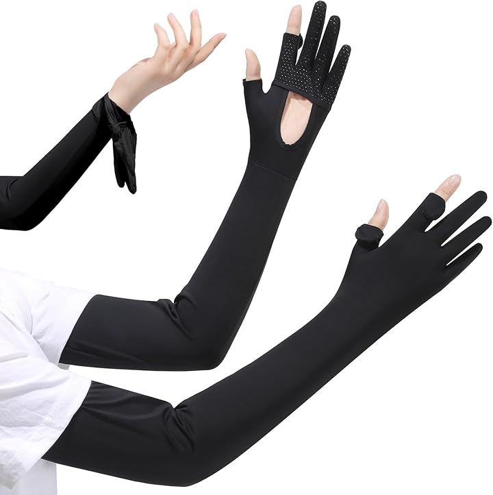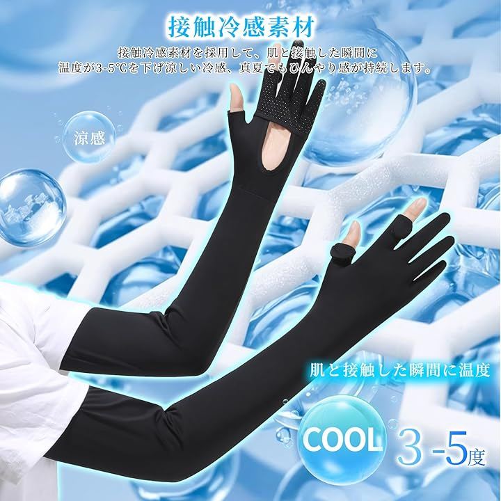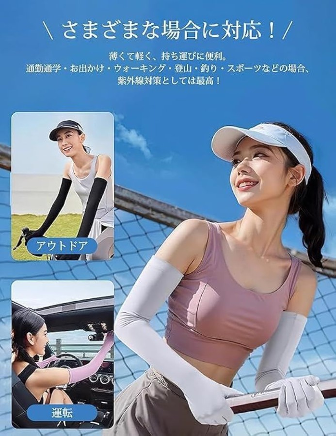 「UVカット手袋+アームカバー2in1」UPF50+の接触冷感アイスシルク素材を使用したこのUVカットアームカバーは、99%以上の紫外線をブロック。バイク通勤やドライブ時のハンドル操作はもちろん、ガーデニングやアウトドアアクティビティでも、手や腕の日焼けを徹底ガード。