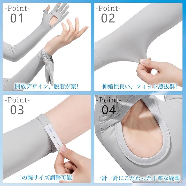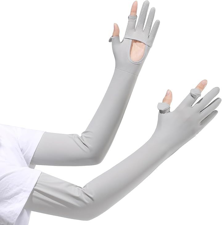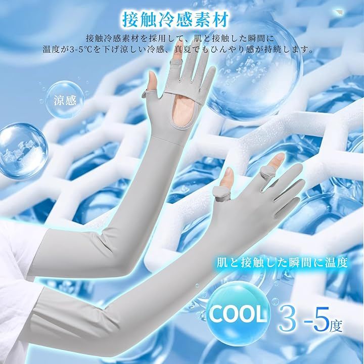 UV-cut arm sleeves with palm openings, sun protection, cooling effect, full fingertip coverage, smartphone compatible, non-slip, long length, breathable, sweat-wicking, quick-drying, cooling arm sleeves for golf, cycling, motorcycling, driving, and work.