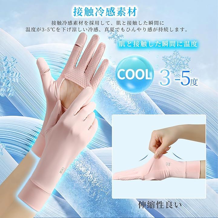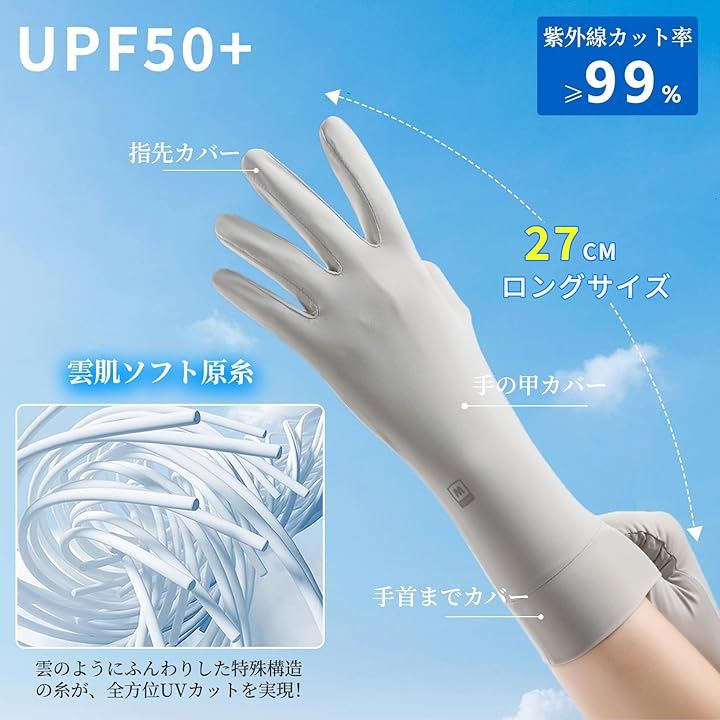「UPF50+、27cmロングサイズで手首までUV対策手袋」99%紫外線カットで、美しい手元をキープ。特殊アイスシルク生地採用で、UVカット率99%を実現。