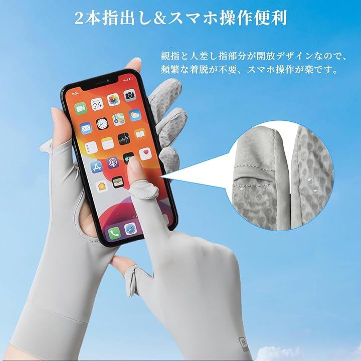 「スマホ対応、2本指出し設計で便利さアップ」手袋を脱がずに、そのままタッチ。親指と人差し指を自由に出せる設計だから、紫外線対策しながらスマホ操作がラクラク。