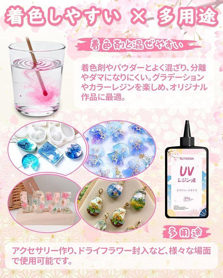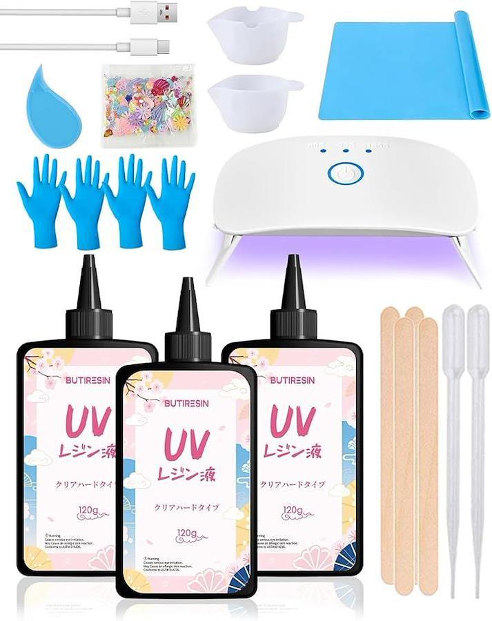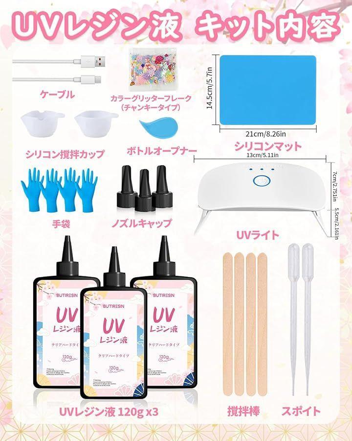 「商品仕様」 *ブランド:BUTIRESIN *セット内容:高品質UVレジン液 120gx3本(計360g)、8W UVライト(8灯搭載)、USBケーブル、シリコンカップx2、シリコンマットx1、手袋x2ペア、開瓶器x1、撹拌棒x4、スポイトx2、DIY装飾パーツセット 「初心者からプロまで、創作を自由自在に」 「これからレジンを始めたい」という初心者の方から、作品を大量に制作する作家の方まで、すべての方に満足いただける豪華なスターターキットです。