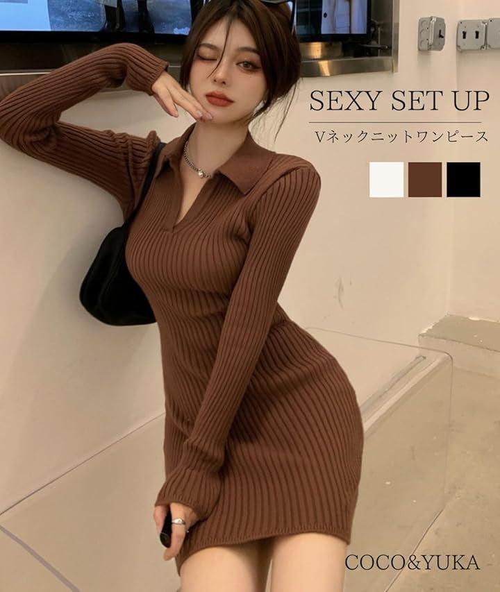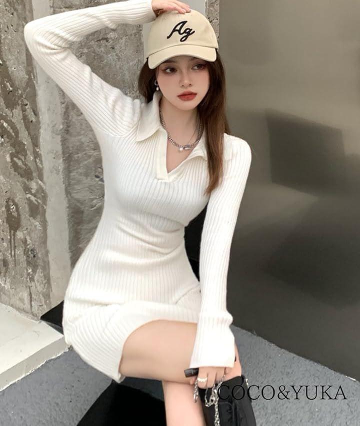 V-neck knit long sleeve mini dress tight sexy ribbed knit simple collared mini dress above knee length women's