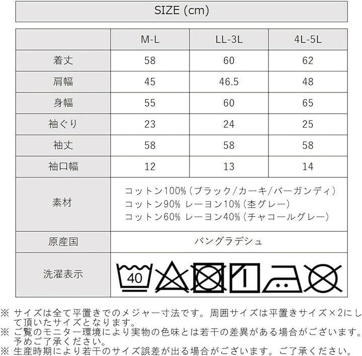 LL-3L:着丈:60cm、肩幅:46.5cm、身幅:60cm、裾幅:60cm、袖ぐり:24cm、袖丈:58cm、袖幅:23.5cm、袖口幅:13cm