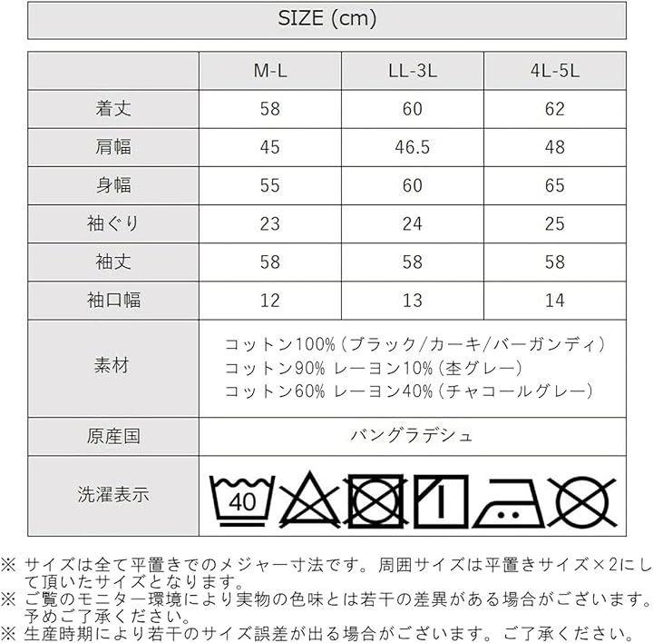 [4L-5Lサイズ]着丈:62cm、肩幅:48cm、身幅:65cm、裾幅:65cm、袖ぐり:25cm、袖丈:58cm、袖幅:24.5cm、袖口幅:14cm