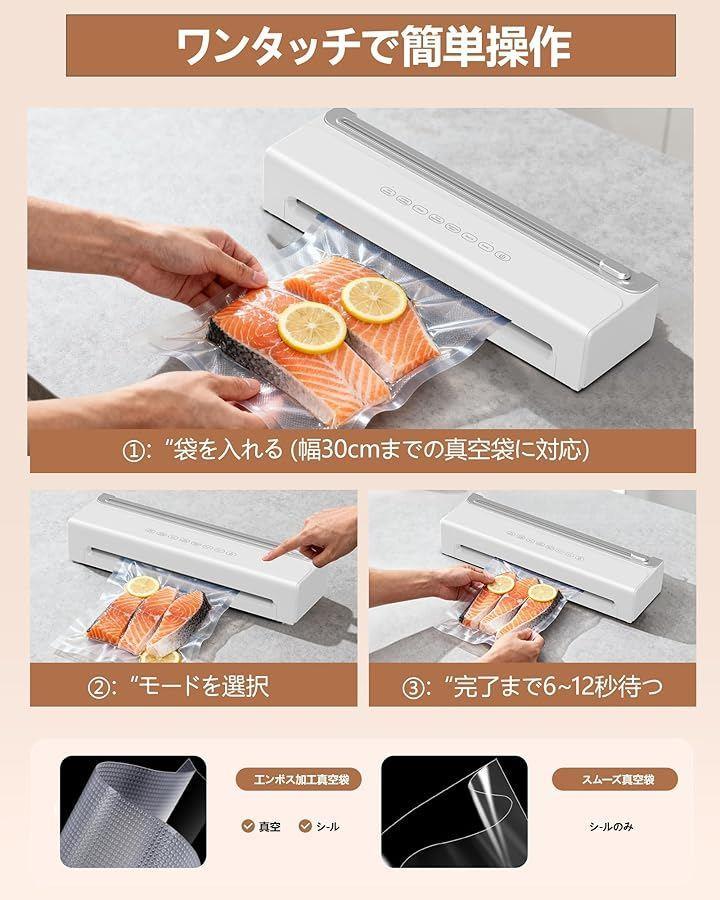 ワンステップ操作:真空袋を挿入>タッチ>密封完了。