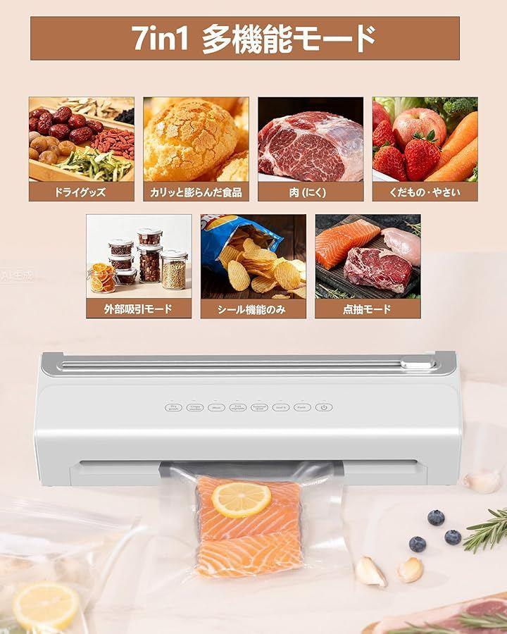 「真空機7種類のモード切替。用途に合わせた最適化」 真空パック機 干物・膨脆・肉類・野菜・外抽・単封・点抽の7モードを搭載。