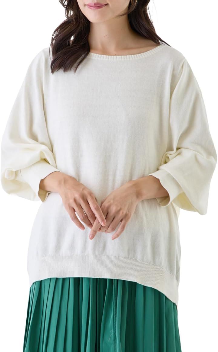「首元がすっきりしたデザインで小顔効果も期待」シンプルなボートネックは上品で落ち着いた印象にを与えます。