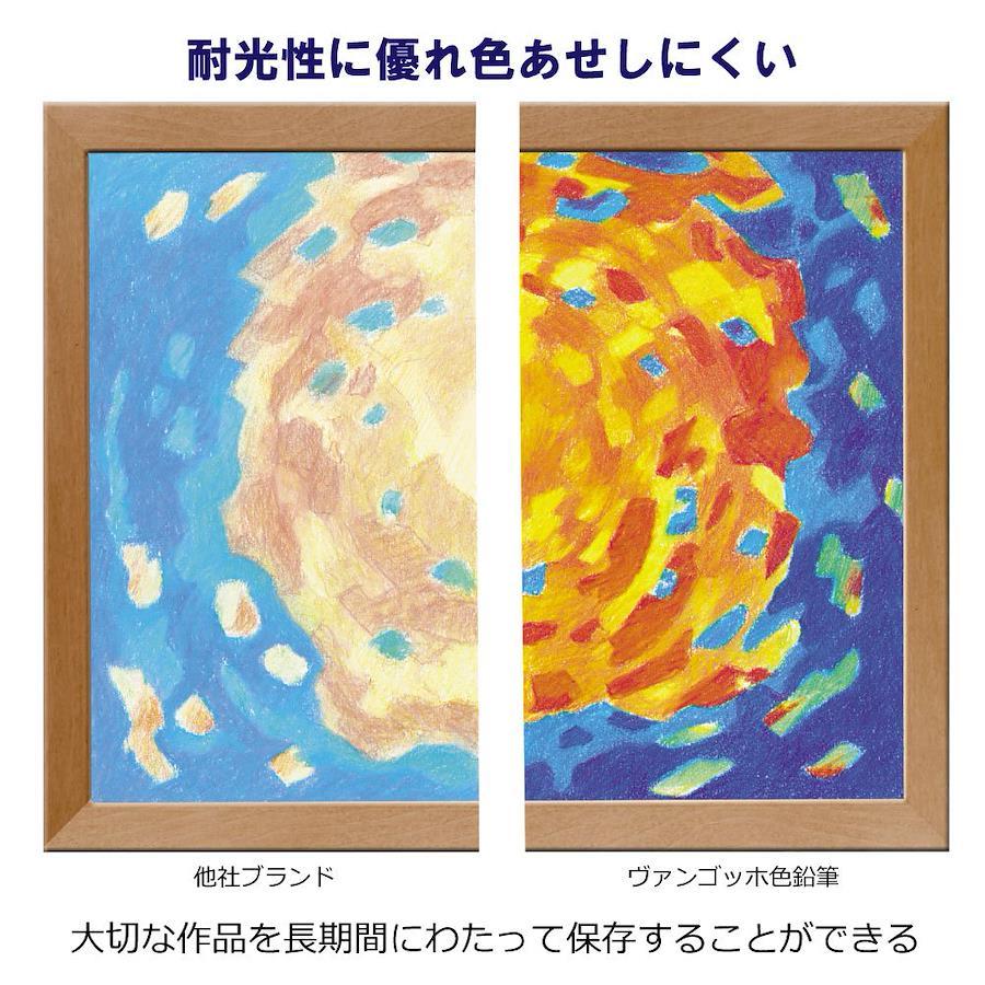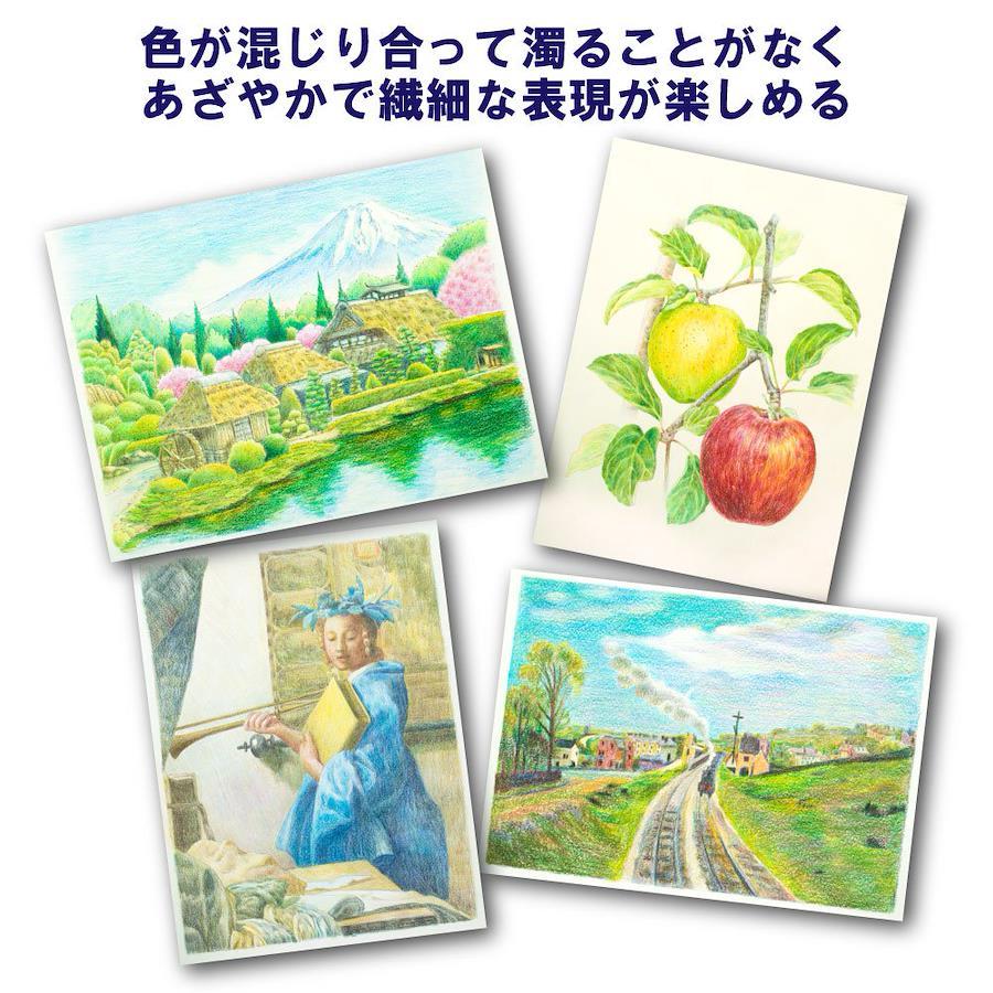 高品質の色鉛筆で色が混じり合っても濁ることがなく、鮮やかな絵に仕上げることができる。なめらかな塗り心地と鮮やかな発色で、繊細な表現が楽しめる。また、優れた耐光性が持っているので、長期間にわたって色あせることがない。色鉛筆の60色セットチタニウムホワイト、ネープルスイエローライト、イエローオーカー、イエローオーカーライト、ゴールドオーカー、ローシェンナ、オレンジ、パーマネントレモンイエロー、パーマネントイエローライト、パーマネントイエローミディアム、パーマネントイエローディープ、バーミリオン、バーントカーマイン、マダーレーキディープ、スカーレット、ライトオキサイドレッド、キャパットモーチャムレッド、インディアンレッド、パーマネントレッドパープル、パーマントレッドライト、パーマネントレッドディープ、フレッシュチント、パーマネントレッドミディアム、バンダイクブラウン、グリニッシュアンバー、バーントシェンナ、ウルトラマリン、ウルトラマリンバイオレット、キングスブルー、ターコイズブルー、アズールブルー、スカイブルー、パーマネントバイレットミディアム、スカイブルーライト、ライラック