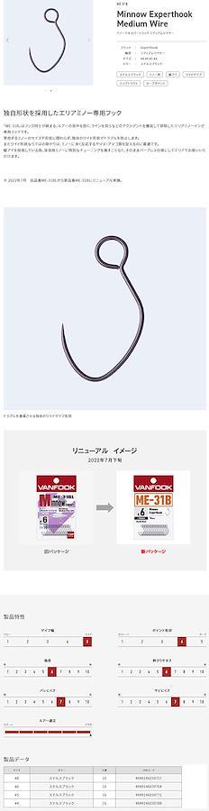 独自形状を採用したエリアミノー専用フック!「ME-31B」はフック同士が絡まる、ルアーの背中を抱く、ラインを拾うなどのアクシデントを徹底して排除したエリアミノーイング専用フックです。使用するミノーのサイズや形状に関わらず、独自のワイド形状がトラブルを防止します。またワイド形状ならではの掛かりは、ミノーに良く反応するヤマメ・アマゴ類を捉えるのに最適です。縦アイを採用している為、渓流用ミノーに特別なチューニングを施すことなく、そのままバーブレス仕様にしてエリアでお使いいただけます。