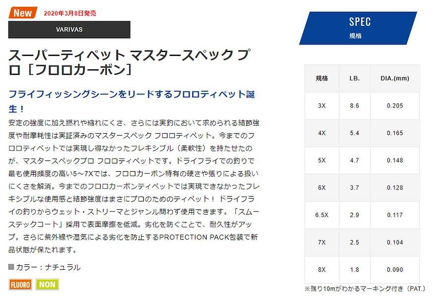 フライフィッシングシーンをリードするフロロティペット誕生! 安定の強度に加え撚れや縮れにくさ、さらには実釣において求められる結節強度や耐摩耗性は実証済みのマスタースペック フロロティペット。今までのフロロティペットでは実現し得なかったフレキシブル(柔軟性)を持たせたのが、マスタースペックプロ フロロティペットです。ドライフライでの釣りで最も使用頻度の高い5~7Xでは、フロロカーボン特有の硬さや張りによる扱いにくさを解消。今までのフロロカーボンティペットでは実現できなかったフレキシブルな使用感と結節強度はまさにプロのためのティペット! ドライフライの釣りからウェット・ストリーマとジャンル問わず使用できます。「スムーステックコート」採用で表面摩擦を低減。劣化を防ぐことで、耐久性がアップ。さらに紫外線や湿気による劣化を防止するPROTECTION PACK包装で新品状態が保たれます。