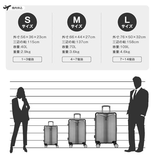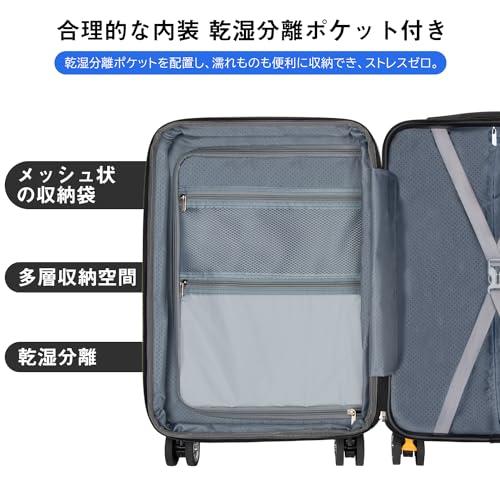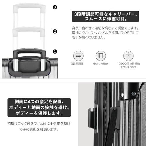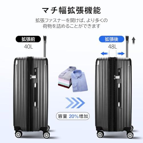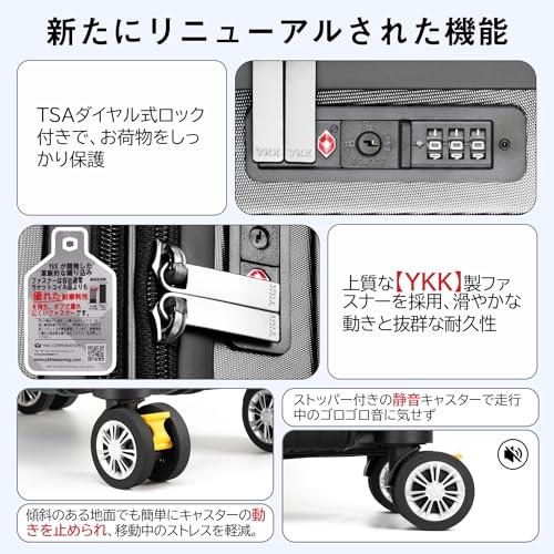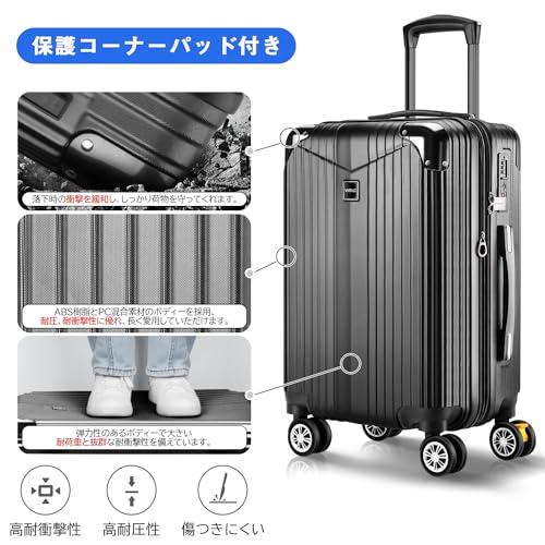 【20%容量拡張&高品質コーナーパッド】スーツケースの拡張機能を利用すれば、マチ幅が5cmほど拡張し、約20%内容量を増加。ABS樹脂とPC混合素材のボディーはただのABS素材より軽量で耐圧性、耐久性に優れています。コーナーパッド付きで、耐衝撃性も抜群です。 【YKK製ファスナー&TSAダイヤル式ロック】スーツケースのファスナーは【YKK】製ファスナーを採用し、滑やかな動きと抜群の耐久性を発揮。(製品に【YKK】制のタグが付いています。)TSAダイヤル式ロック付きでより安全、安心してご利用いただけます。※鍵穴が航空会社の検査専用の物で本製品は鍵が付属しておりません。 【静音キャスター&調節可能なキャリーバー】キャリーケースは三段階調節なアルミ合金制キャリーバーを採用し、スムーズに伸縮可能。TPE素材で作られた静音キャスターが走行中の振動を軽減し、高耐摩耗性、静音性を実現しながら、360°自由に回転可能。後ろの2個のキャスターにストッパー付き、傾斜のある地面でも簡単にキャスターの動きを止められ、移動中のストレスを軽減。 【合理的な内装&乾湿分離ポケット】合理的な内装デザインで乾湿分離ポケットも追加され、濡れものの収納に大変便利。メッシュポケット付きで小物などのお荷物が分かりやすく、一目瞭然。U型仕切り、クロスベルトまで完備され、荷物崩れを完全防止。 【スーツケースベルト付き&永久保証】付属したスーツケースベルトはいざという時にスーツケースをしっかり固定でき、より安心。本製品に永久保証をご提供いたします。永久保証の詳細は取扱説明書をご参考ください。お届けしたキャリーバッグに初期不良または使用中に何が問題がある場合は弊社にご連絡くださいませ。誠心誠意対応させていただきます。