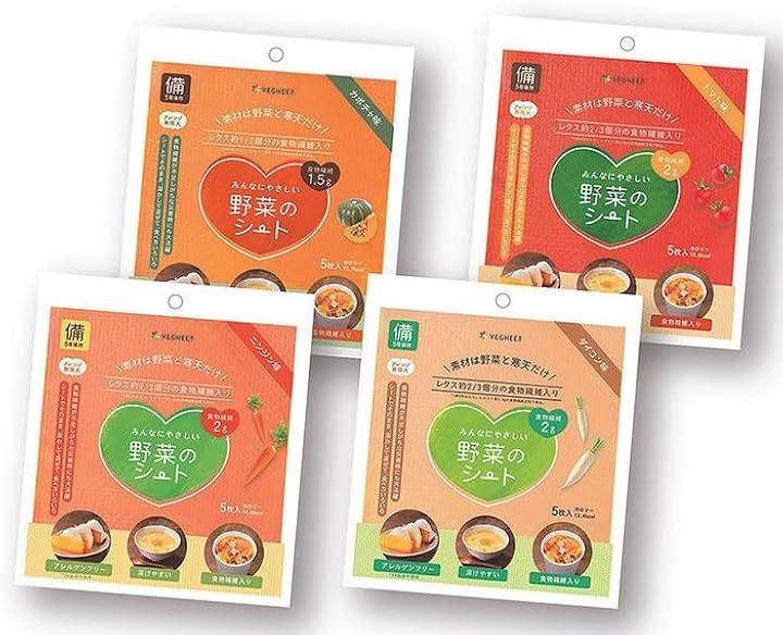 ミニサイズ(通常サイズの4分の1)5枚入り ・単品サイズ:100x95x0.1mm ・風袋込重量:7g ・保存方法:常温(直射日光は不可)、高温多湿でない場所で保存 栄養成分 (1枚当たり) エネルギー 3.93kcal タンパク質 0.06g 脂質 0.04g 炭水化物 0.84g 食塩相当量 0.001g ニンジン、カボチャ、トマト、ダイコン 各1パックずつのアソートセット