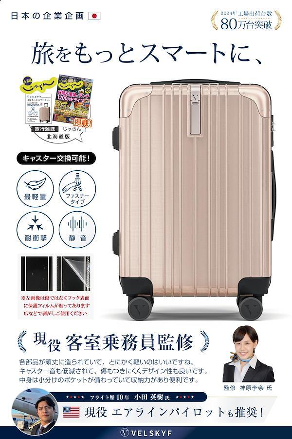 【 現役客室乗務員監修 × 日本企業企画 】現役職務の経験を生かした細部にこだわり多機能性を装備、飽きのこないデザイン性で旅行、ビジネスとシーンを選ばず使用可能。 【 機内持ち込み対応サイズ 】Sサイズは機内持ち込み可能サイズ、3辺合計115cm以内に設計しています。詳しくは各旅行会社にお問い合わせ願います。 【 驚くほど軽量、頑丈なボディ 】Sサイズ2.8kg Mサイズ3.5kg Lサイズ4.2kg 持った瞬間、思わず声がでるほどの軽さに仕上げ、PC70%( ポリカーボネイト )+ABS樹脂30%の混合比で作られた頑丈なボディです 【 キャスター音 軽減 】キャスター部に特殊な材質を採用しアスファルト上でも回転摩擦音を低減しました。 【 TSAロック ダイヤル式採用 】鍵不要のダイヤル式ロック、3桁の暗証番号を設定しもう鍵をなくして困る心配は不要。 【 指定パーツの新品不具合時の無期限保証 】VELSKYFはキャリーバー、キャスター、ハンドル、TSAロック、フックの5点について保証期限を設けておりません、国内でサポートいたします。※製造過程での破損、不具合があった場合に限ります