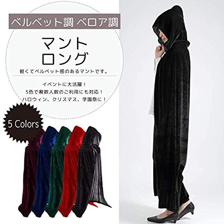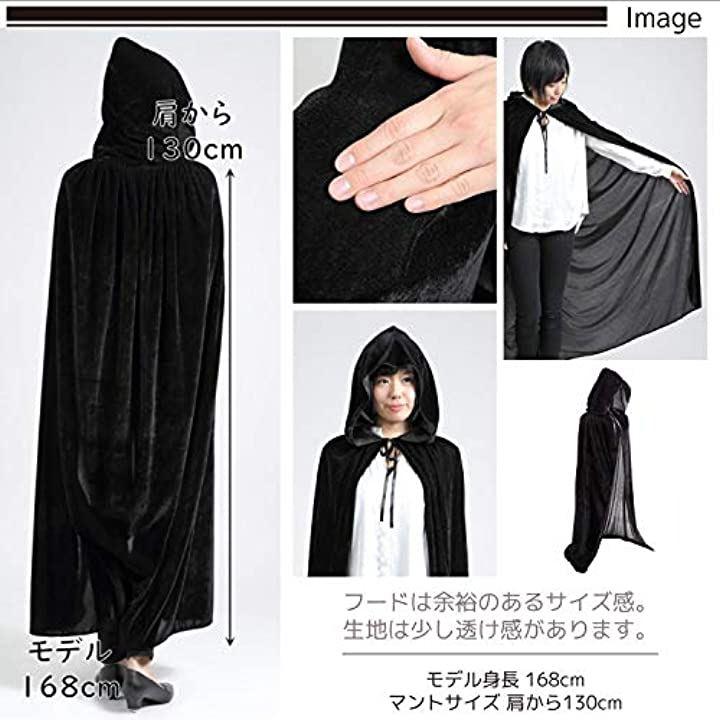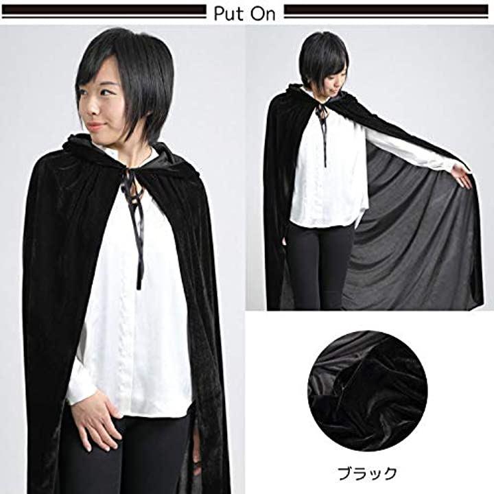 ベルベット調(ベロア風)で高級感のあるマント。フード付き、羽織るだけで雰囲気満点。