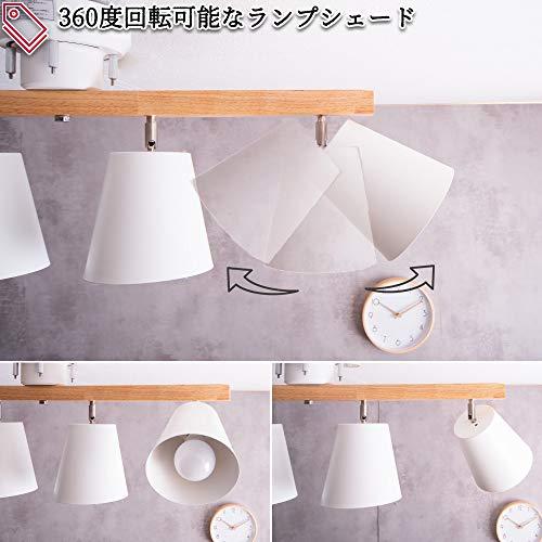 Point 2.【天然木とスチールの異素材でこなれ感を演出。】 ライトカバーを固定するレバーには、ムードある天然木を使用。 天然木ならではの木目は、よくあるプリントでは出せないあたたかみがあります。ベースのスチール素材が透けて見えることがないよう丁寧に塗装を施し、艶感をなくしたマットな仕上がりに。 落ち着いたムードと高級感をお楽しみください。ヘッド部分は大胆なペンダント風シェードを採用。電球ソケットの部分が隠れて見えない分、ホワイトのほうは全体としてぽっちゃりとした柔らかい印象に、ブラックのほうは存在感のあるモダンな雰囲気になりました。また、大きいシェードの照明角度が大きく、部屋全体も更に明るくなります。本商品は一般的なシーリングスポットライトよりも照明角度が広く、スポットライトでありながら部屋全体を明るくしてくれます。4灯のデザインがいいですが部屋全体も明るくしたい場合にお勧め。 一方、当社の通常モデルjuno、照明角度が小さいので、ヘッド向いた角度をスポット的に明るく照らします。空間を部分的に明るくして強調する場合に最適なモデルです。