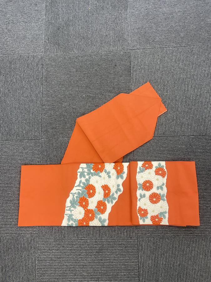【商品概要】 鮮やかな朱色(オレンジ色)の地に、紅白の菊(キク)が流れるように描かれた名古屋帯です。 パッと目を引くレトロモダンなデザインで、アンティーク着物や小紋、紬などのカジュアルな装いのアクセントに最適です。 日本の伝統的な花である菊の文様は、長寿や無病息災を願う吉祥文様としても知られています。