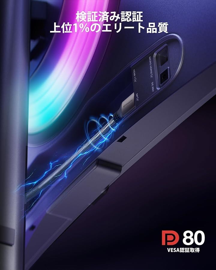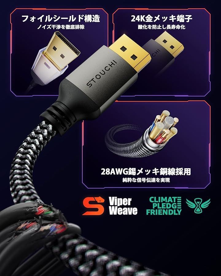 「16K/60Hz・高解像度&高フレームレート対応」DP2.1仕様に準拠したStouchiケーブルは、最大16K(15360x8640)@60Hz、10K@120Hz、8K@144Hz、4K@240Hzの映像出力に対応。
