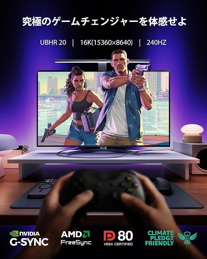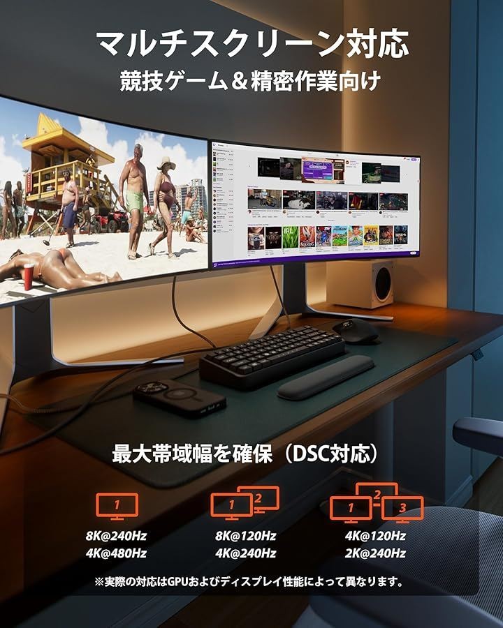 DP2.1規格ならではの高帯域(最大80Gbps)で、4K@240Hzまでの超高フレームレートにも対応。
