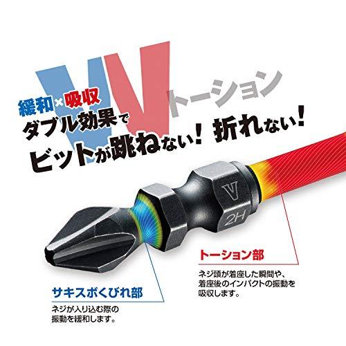 付属のビットはサキスボ形状によりビットの跳ねを防止、効率的に作業が行なえる。また、トーション部が衝撃を吸収、刃先の折れを防止。メーカーによる説明