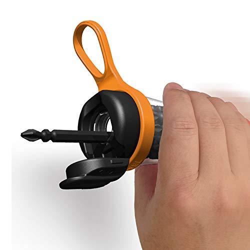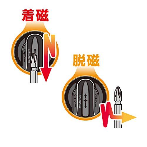 緩和と吸収効果でビットの跳ねや折れを抑制。キャップ部にマグネタイザーが内蔵されているため、ビットの着磁や脱磁が可能。フックにかけられるリング付き。