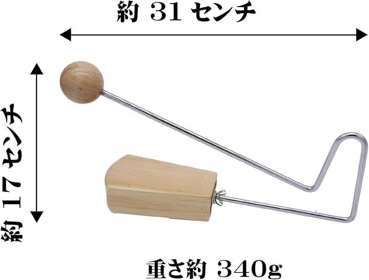 木製の空洞の箱と、木製の球形のおもりがL字型の針金でつながっており、L字の針金の部分の底部を手で持ったり、固定させたりしておもりの部分を叩くと、その振動が空洞の箱に伝わり振動音を発生します。