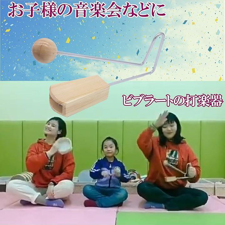 ・木製の空洞の箱と、木製の球形のおもりがL字型の針金でつながっており、L字の針金の部分の底部を手で持ったり、固定させたりしておもりの部分を叩くと、その振動が空洞の箱に伝わり振動音を発生します。