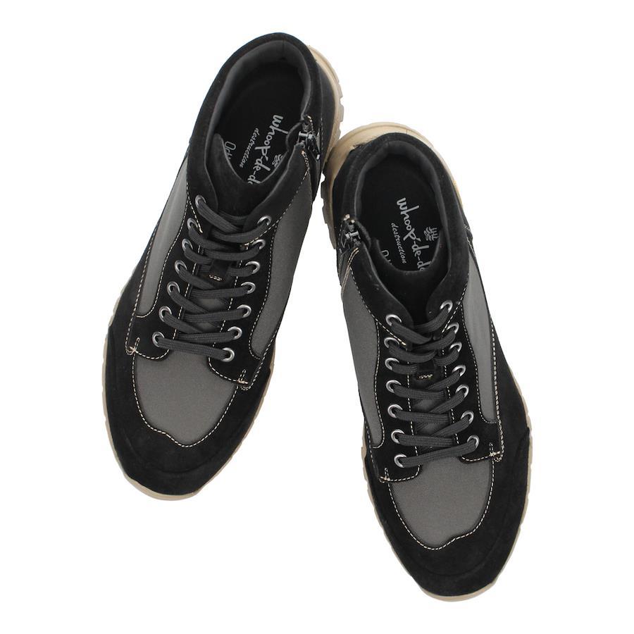 | Vibram メガグリップソールのタフなスニーカーブーツ 【素材】 撥水加工を施した発色の良い牛スエード革と、優れた耐久性を持つCORDURAナイロンを使用。 ※本革を使用していますので多少のムラ・小傷がございます。 【デザイン】 乾いた路面、濡れた路面いずれにおいても比類なきグリップ力を発揮するヴィブラム・メガグリップを使用したタウンユースカジュアルブーツ。 発色の強い色味を緩和させるため、あえて底材はナチュラルカラーに統一。 アッパーには撥水素材を採用し、天候の変動にも柔軟に対応できるオールランドシューズ。 【サイズ感】 革靴で25.5cm、スニーカーで26.5-27cmを着用するスタッフで<41/25.5cm>でジャストサイズでした。サイズ感は、個人差がございますのであくまで参考程度にお考えください。 ■ブランド:whoop'-de-doo' destruction ■カラー:ブラックブラック、ブラックスエード、グレースエード ■アッパー素材:牛革(撥水加工)×CORDURA・ナイロン ■裏地:生地 マイクロファイバー(吸汗) ■底材:ラバー Vibram・メガグリップ ■ソール:約2.5cm ■ヒール:約3.5cm ■重さ(片足):約459g ■製法:セメント製法 ■中国製 *上記は全て25.5cmで計測した数値です。 *多少の誤差が生じる場合がございますので予めご了承下さい。 whoop de doo co.,ltd whoop'-de-doo' フープディドゥ |