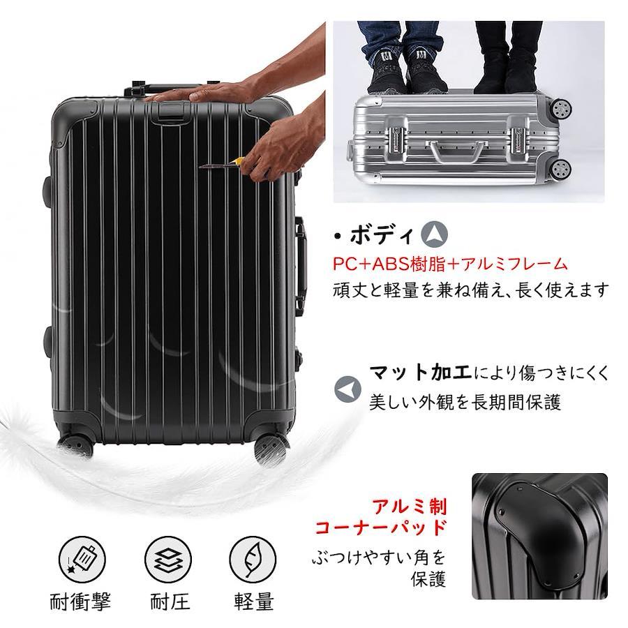 【PC+ABS樹脂+アルミフレーム】vilgazzキャリーケースは頑丈なボディと超軽量デザインが特徴です。さらに表面はマット加工で、傷つきにくいです。重量わずか3.65kgで、疲れずに持ち運べます。容量は44?、1泊から3泊の短期旅行に十分な大きさです。 【ダイヤル式TSAロックを二つ】世界基準のTSAロックを二つ搭載しており、安全性が向上しています。暗証番号を設定するだけで、鍵をなくす心配もありません。 【ゴム付きダブルキャスター 静音&スムーズ】静音性と耐久性に優れたダブルキャスターを採用しており、安定感が向上し、360度自由回転で、でこぼこの道でもスムーズな移動が可能です。また、キャスター部に特殊ゴムを採用しアスファルト上でも回転摩擦音を低減しました。 【多機能性キャリーバッグ】アルミ製のキャリーバーが頑丈で、高さは3段階調節、ご自分の身長に合わせてスムーズに調整が可能です。また、四つの角を傷や衝撃から保護ため、アルミ制コーナーパッドを採用しております。さらに、隠しフック搭載し、バッグなどを掛けて、手の負担を軽減します。 【1年間保証】ご使用中、もし何か不具合があった場合は、お手数ですがメールにてご連絡ください。お客様の「困った」を全力で解決いたします。付属品:防塵カバー、日本語取り扱い説明書