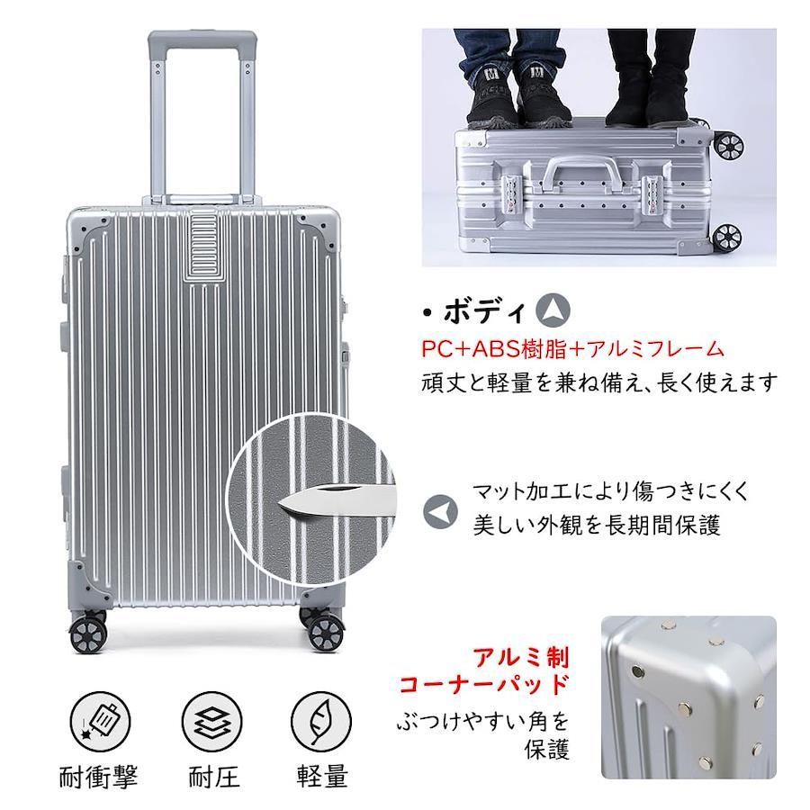 【頑丈なボディ 超軽量】PC+ABS樹脂、強度を向上し軽量化も実現したデザイン。さらに、vilgazzスーツケースは耐衝撃性と耐久性に優れた強化アルミフレームを採用しており、衝撃から荷物をしっかり守ります。重量わずか4.21kg、容量は71?、7泊以上の旅行や海外出張には十分な大きさです。 【ダイヤル式TSAロックを二つ】世界基準のTSAロックを二つ搭載し、スタイリッシュでありながら、外出がより安全になります。鍵不要のダイヤル式ロック、3桁の暗証番号を設定しもう鍵をなくして困る心配は不要。※本体の鍵穴はTSA職員の検査用ですので、お客様には付属の鍵はございません。 【ゴム付きダブルキャスター 静音&スムーズ】1つのキャスターにタイヤが2つ付いている双輪キャスターです。安定感が向上し、360度自由回転で、でこぼこの道でもスムーズな移動が可能です。また、キャスター部に特殊ゴムを採用しアスファルト上でも回転摩擦音を低減しました。 【三段調節キャリバー アルミコーナーパッド】アルミ製のキャリーバーが頑丈で、高さ3段階調節、ご自分の身長に合わせてスムーズに調整が可能です。また、四つの角を傷や衝撃から保護ため、アルミ制コーナーパッドを採用しております。 【1年間保証】ご使用中、製品に何か不具合があった場合は、メールにてご連絡ください。お客様の「困った」を全力で解決いたします。付属品:防塵カバー、日本語取り扱い説明書
