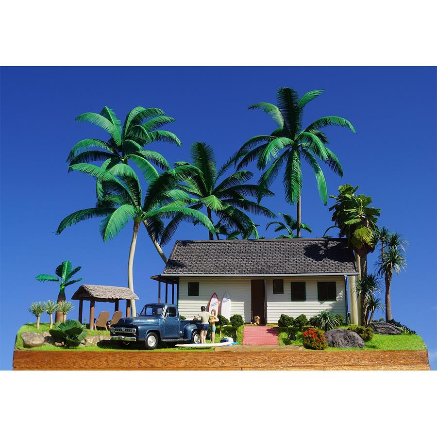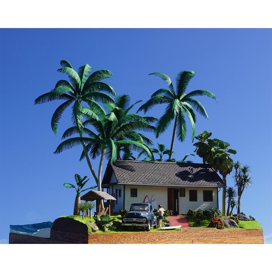 This diorama work has a resort-like atmosphere, made withrealistic palm trees and waves.