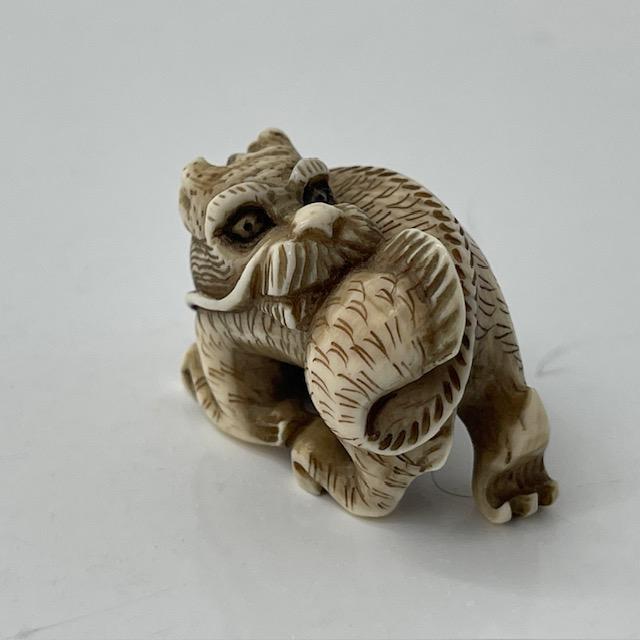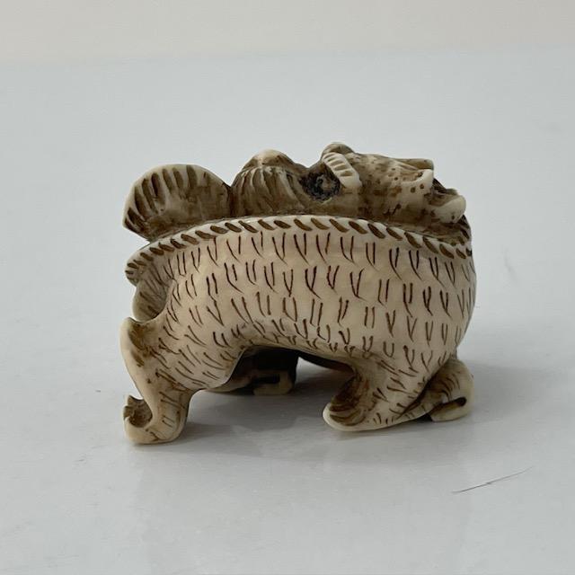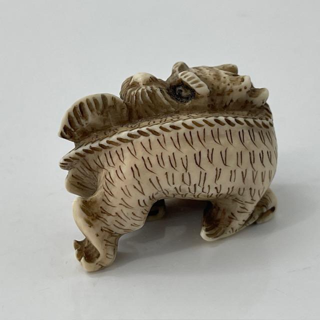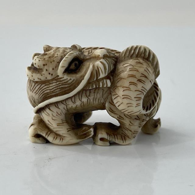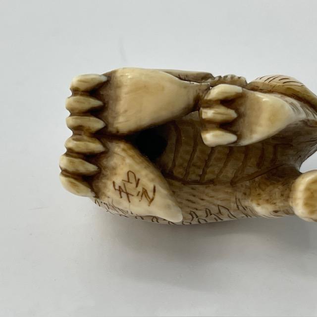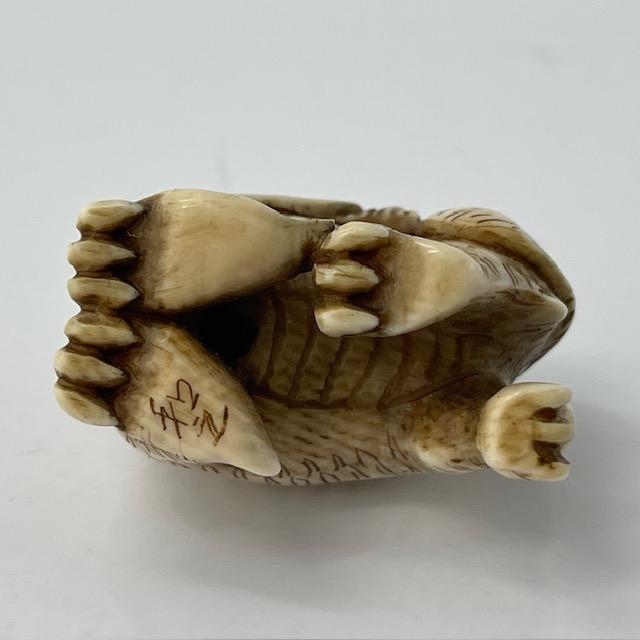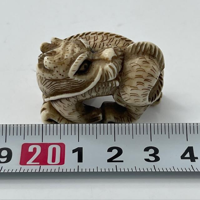 推定1900年~1940年頃の制作と思われる根付です。足の裏に「和之」(かずゆき)のサインがあります。材質は、骨です。龍を題材としたもので、精密な彫りになっています。足の付け根に穴があいており、現在ではひもを通して、モバイルホーンにつけても使えます。