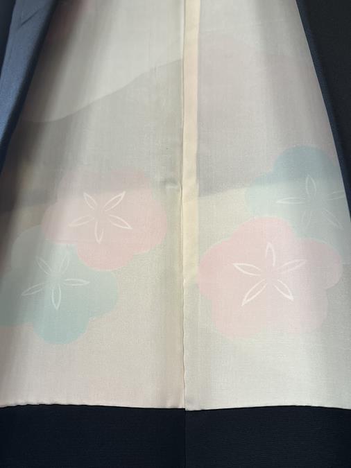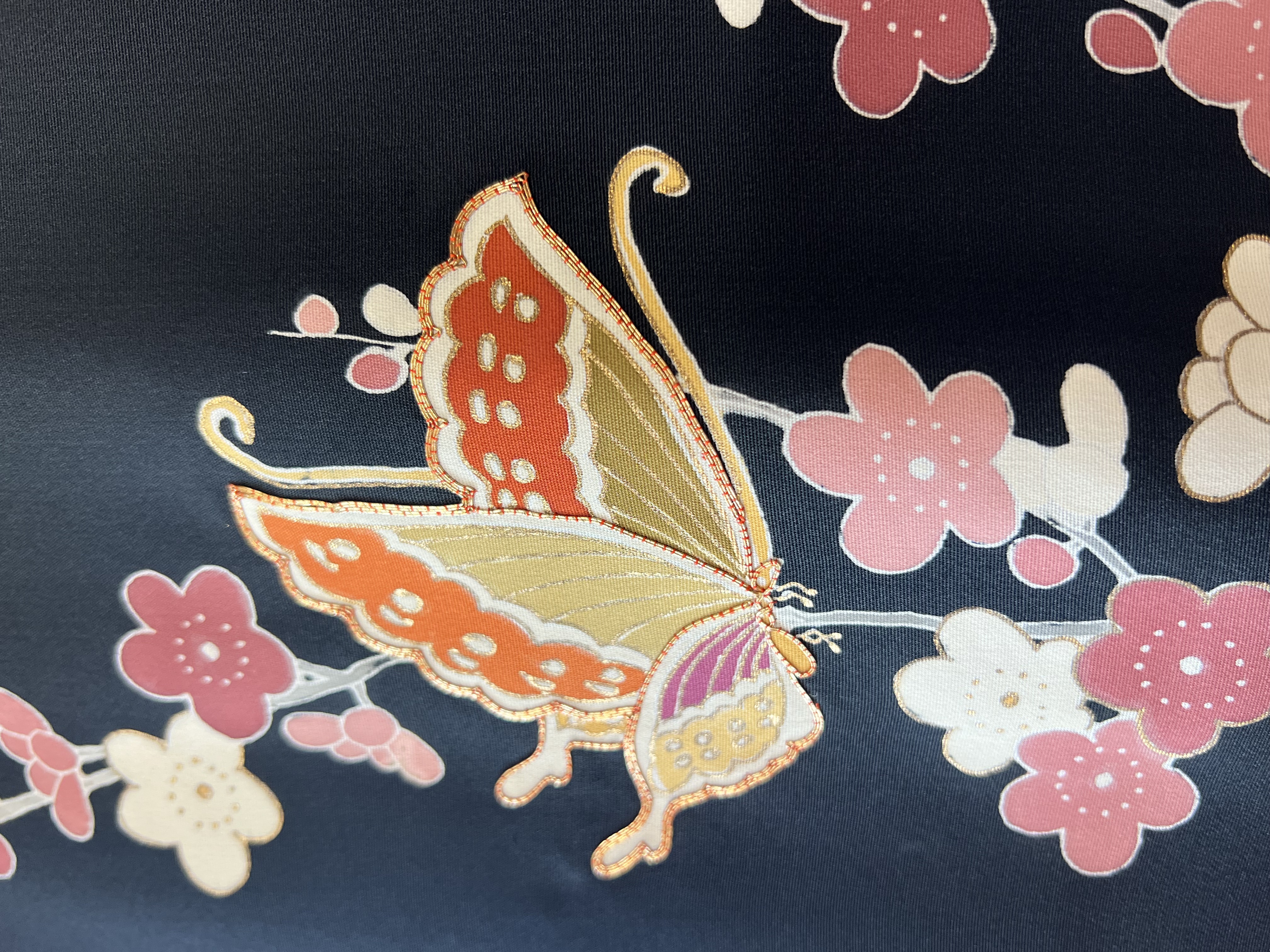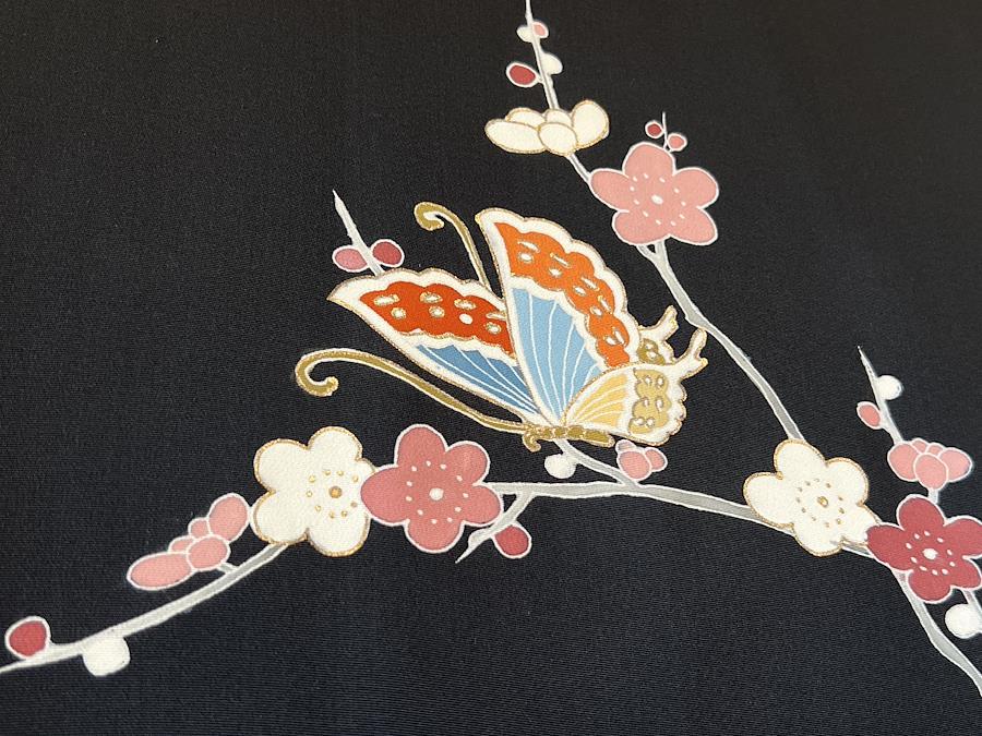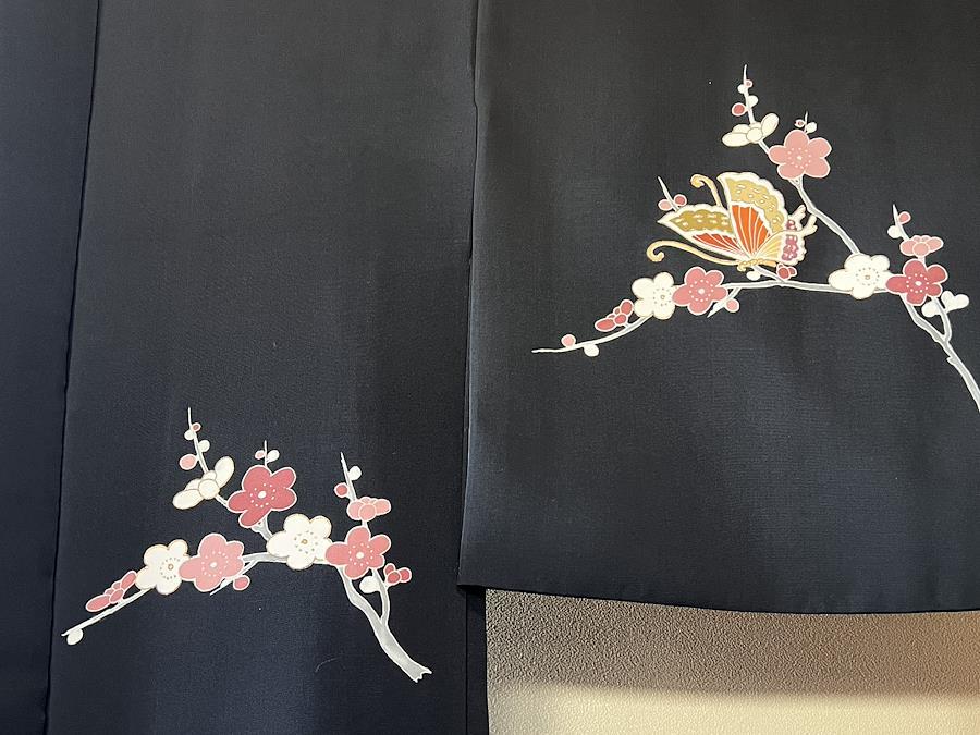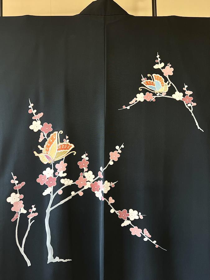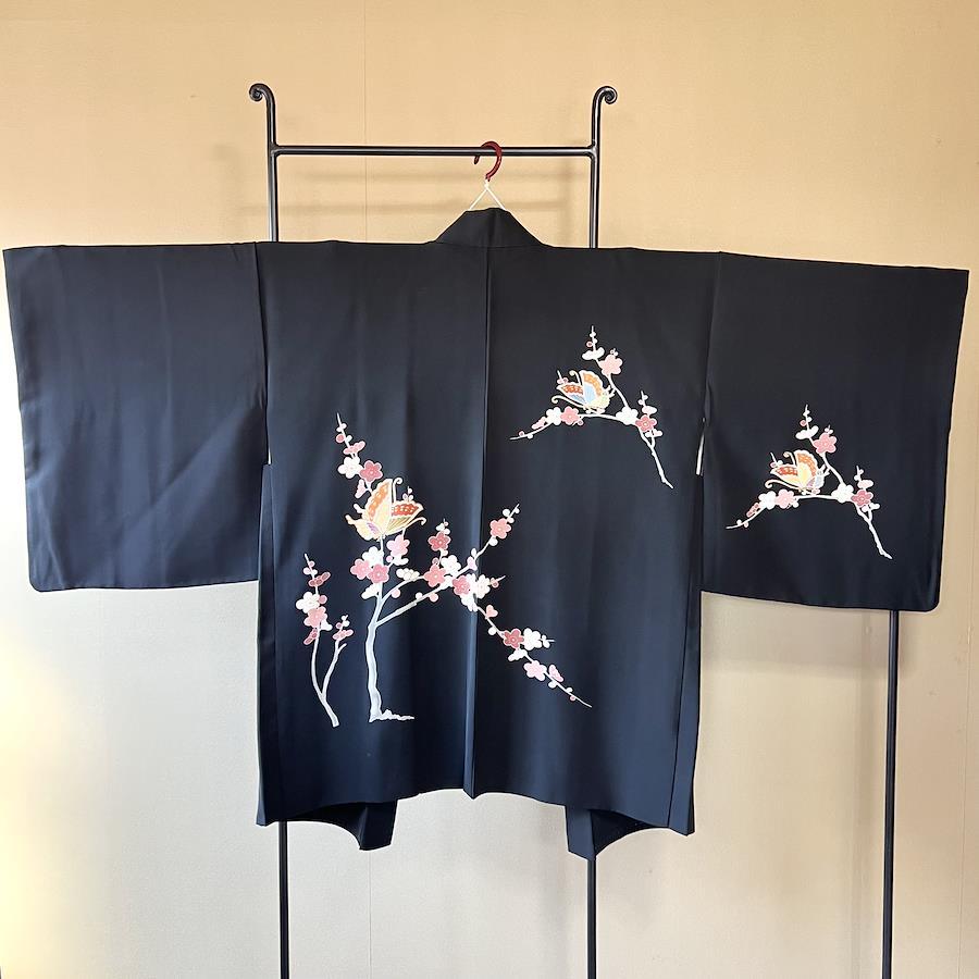 これはヴィンテージの羽織です。こちらは手描きで枝梅と蝶が描かれています。蝶には金彩の刺繍が施されています。黒の羽織はデニムやスカートと合わせてドレスアップも楽しみやすく人気な商品です。
