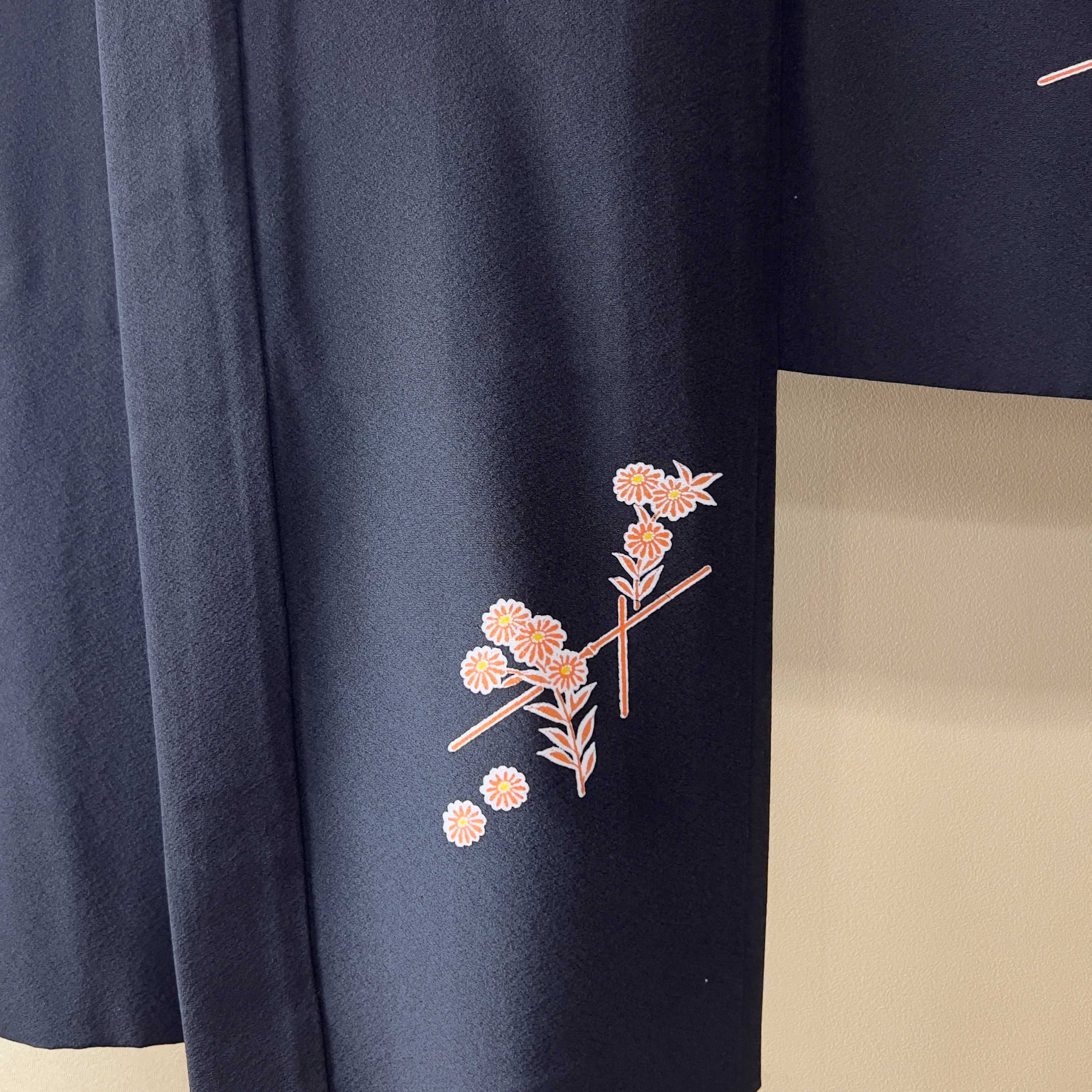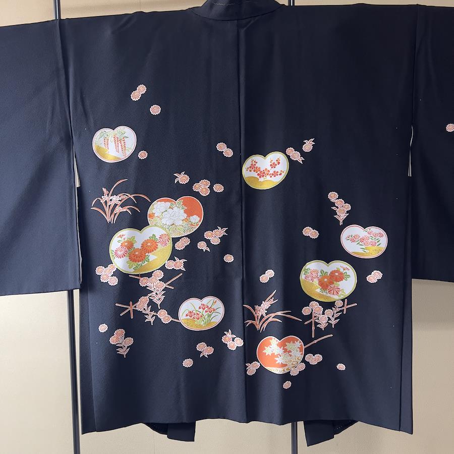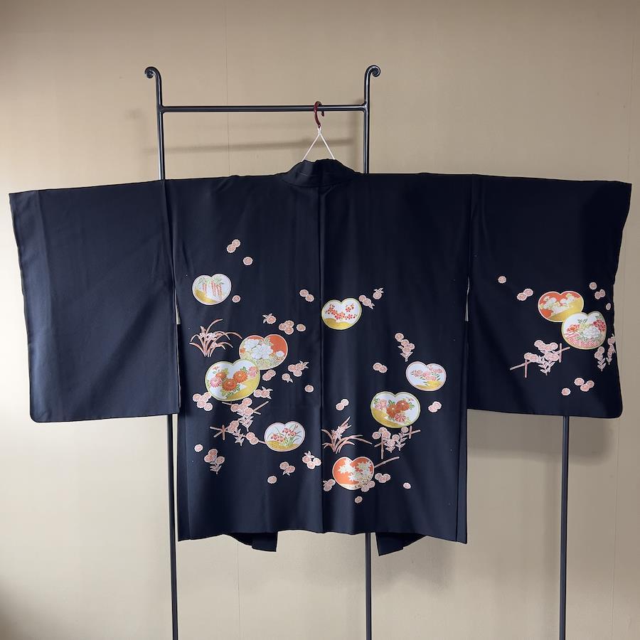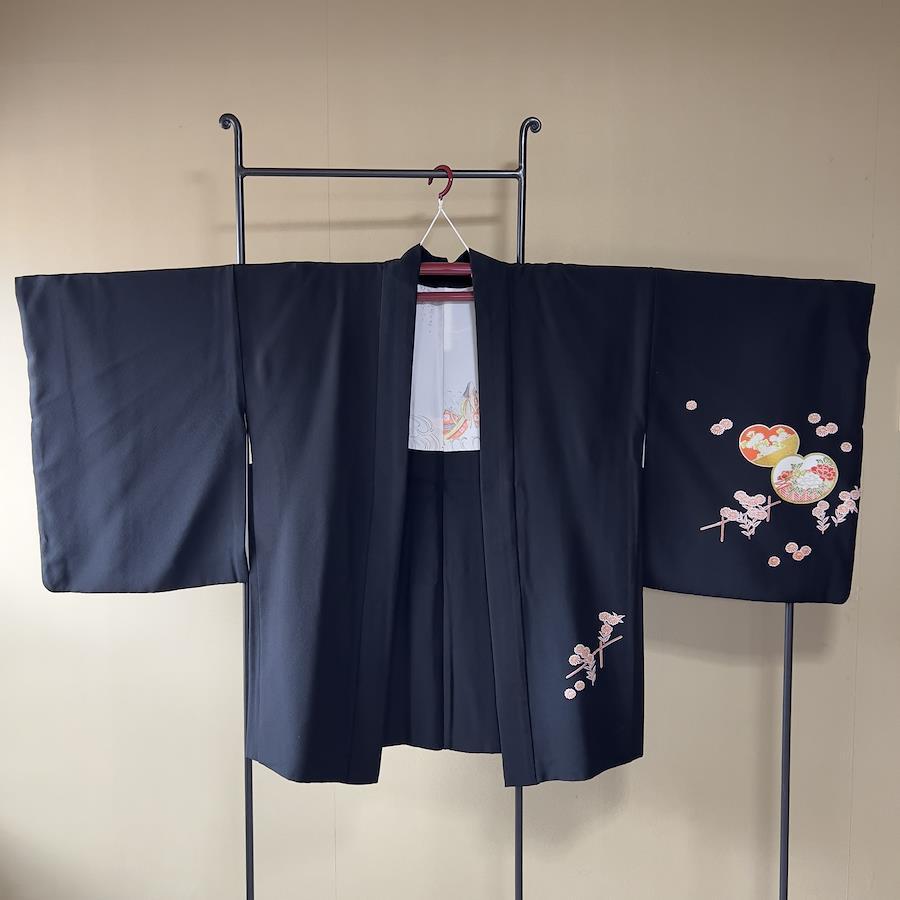 これはヴィンテージの羽織です。こちらは手描きで柄が描かれています。黒の羽織はデニムやスカートと合わせてドレスアップも楽しみやすく人気な商品です。