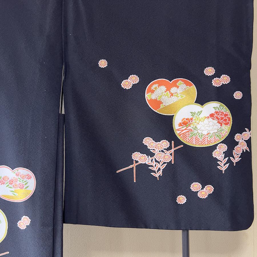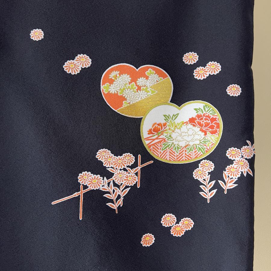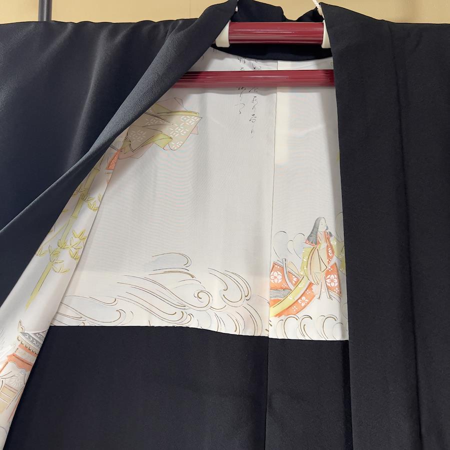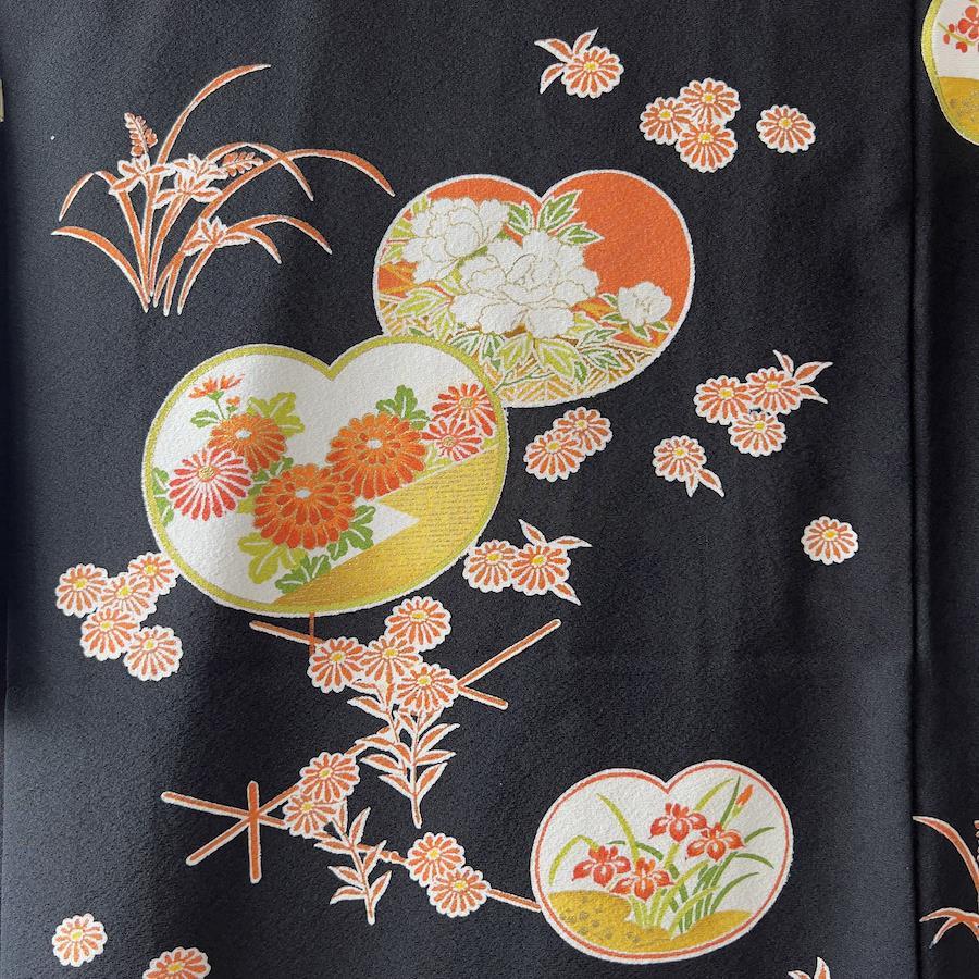 これはヴィンテージの羽織です。こちらは手描きで柄が描かれています。黒の羽織はデニムやスカートと合わせてドレスアップも楽しみやすく人気な商品です。
