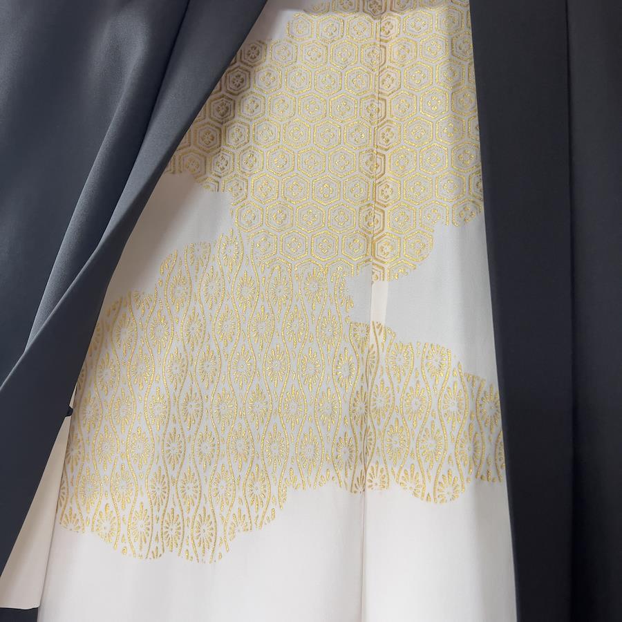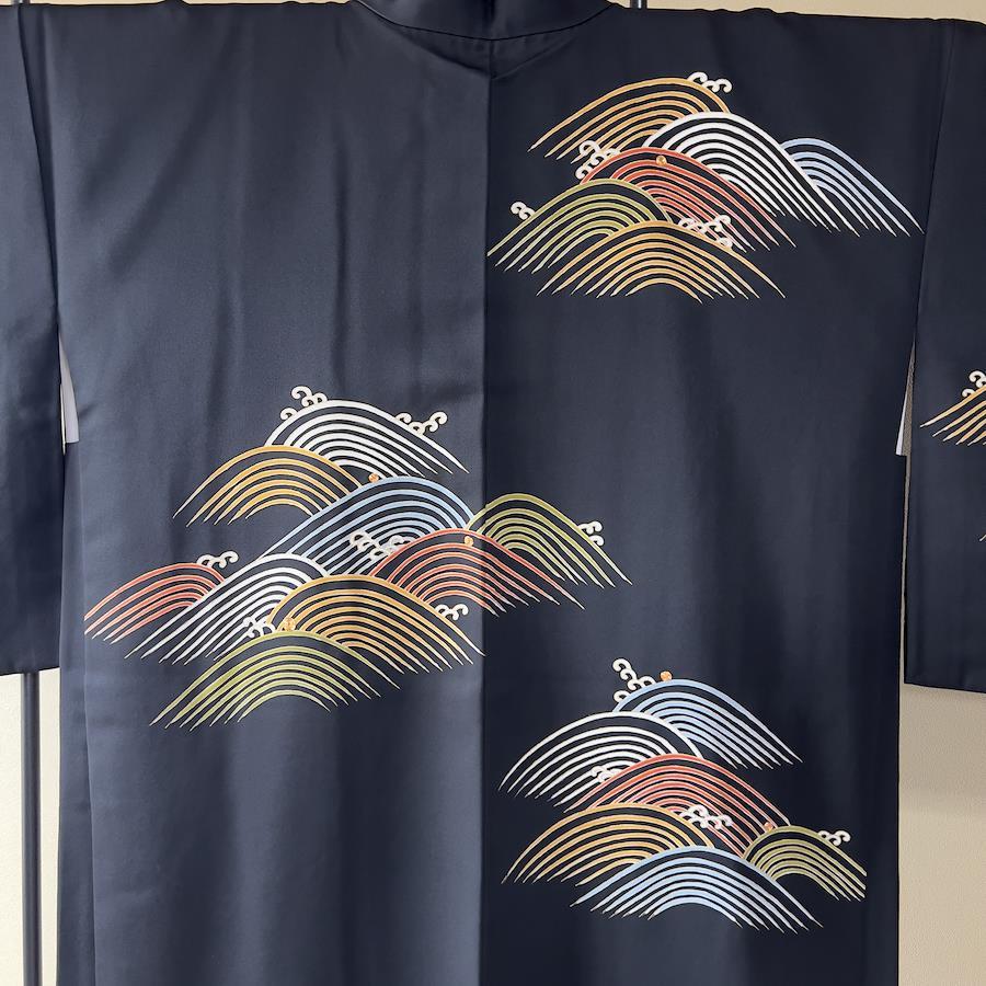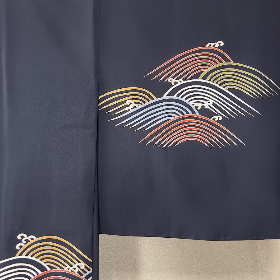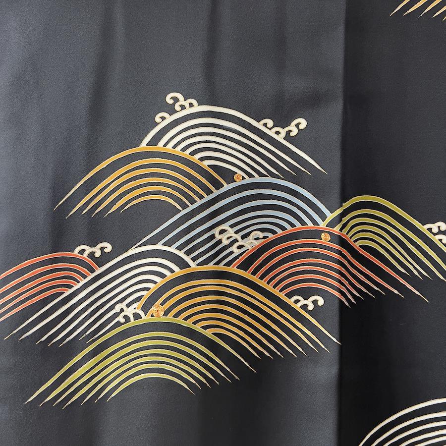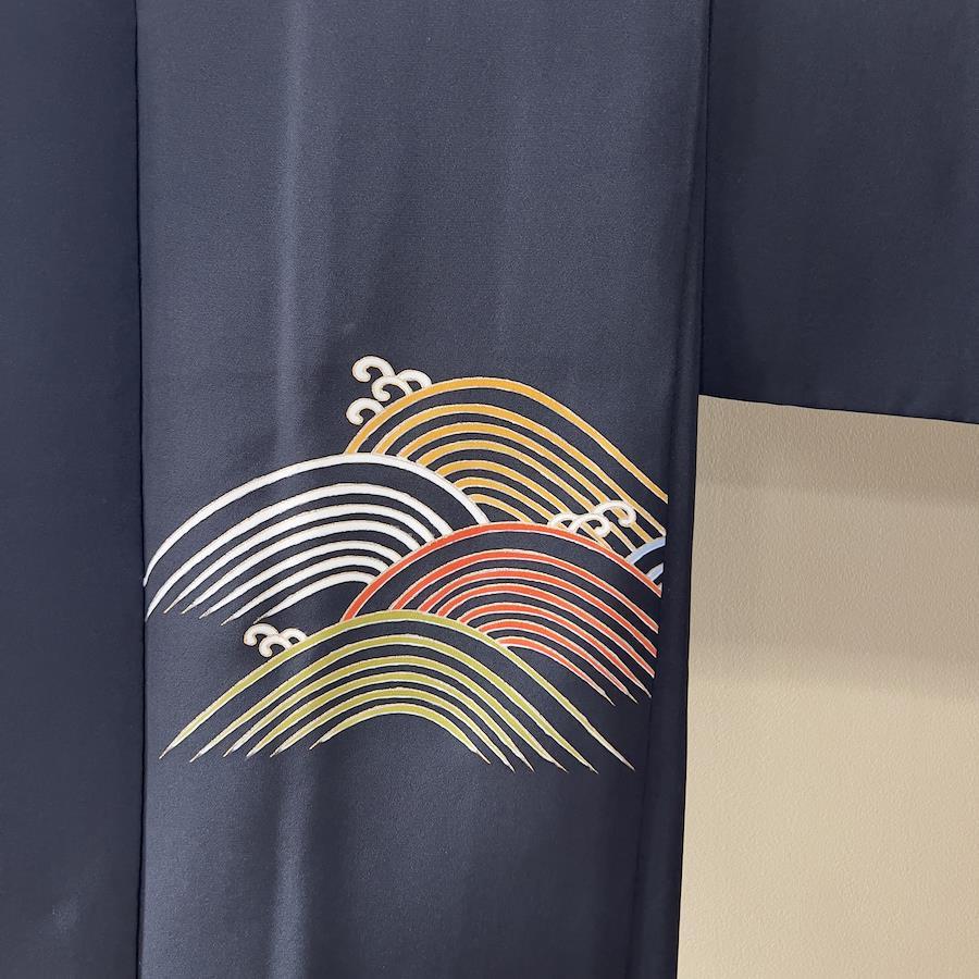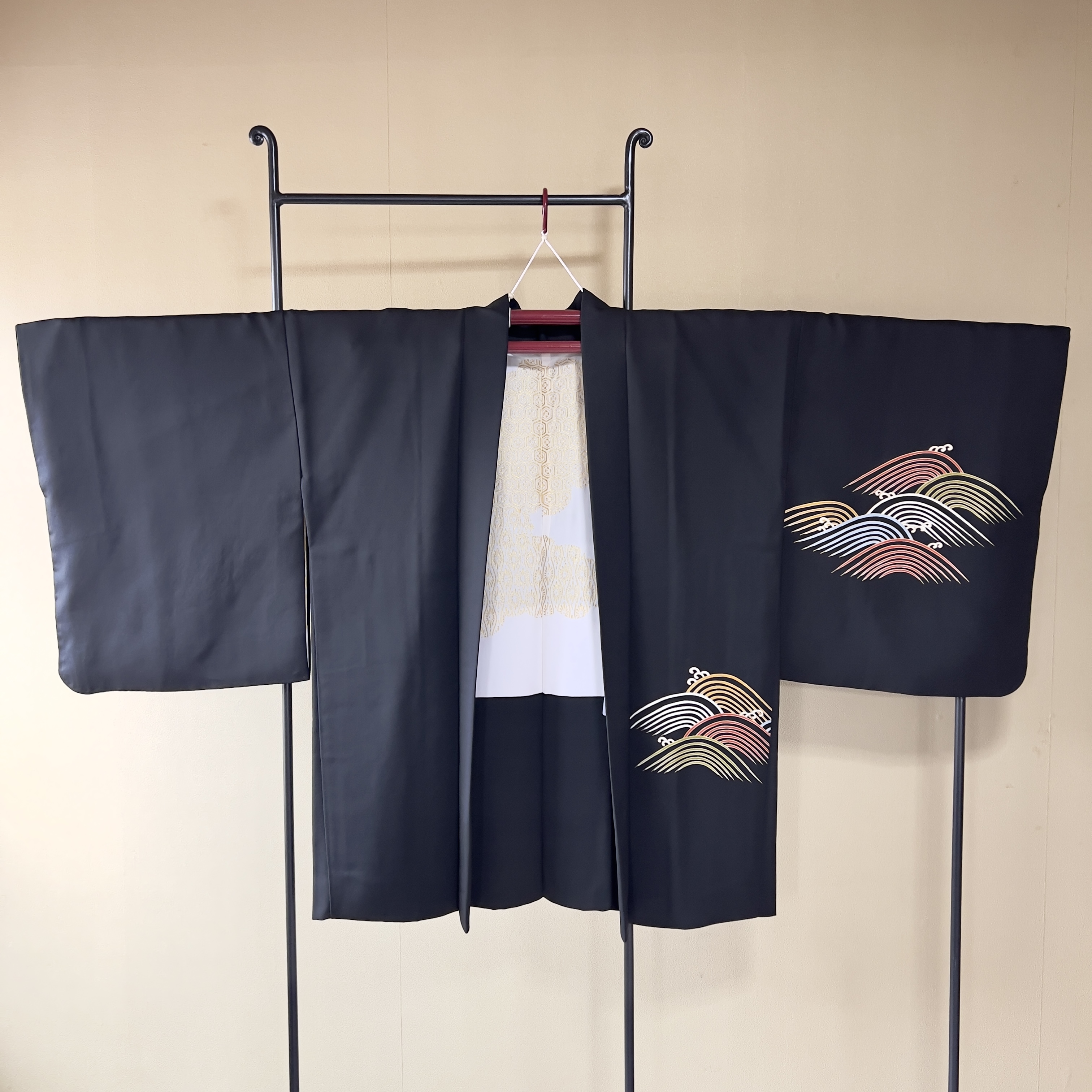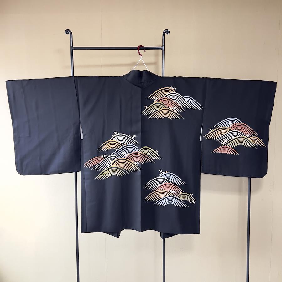 これはヴィンテージの羽織です。こちらは手描きで柄が描かれています。黒の羽織はデニムやスカートと合わせてドレスアップも楽しみやすく人気な商品です。