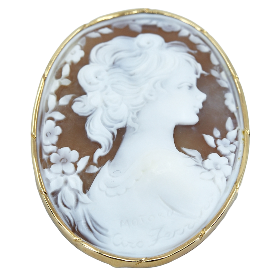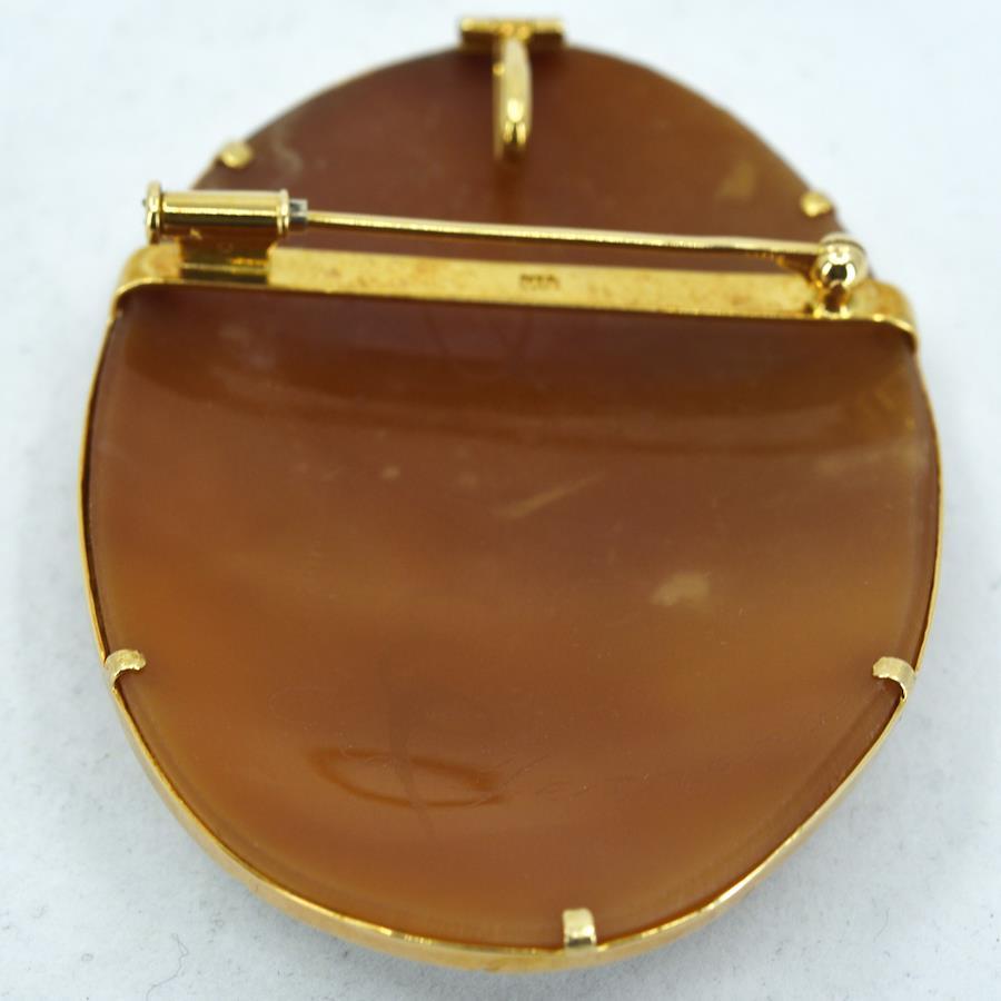 Vintage gold/white cameo brooch with a 18K gold frame and shell. Also suitable as a corsage, lapel pin, decorative pin, or badge.