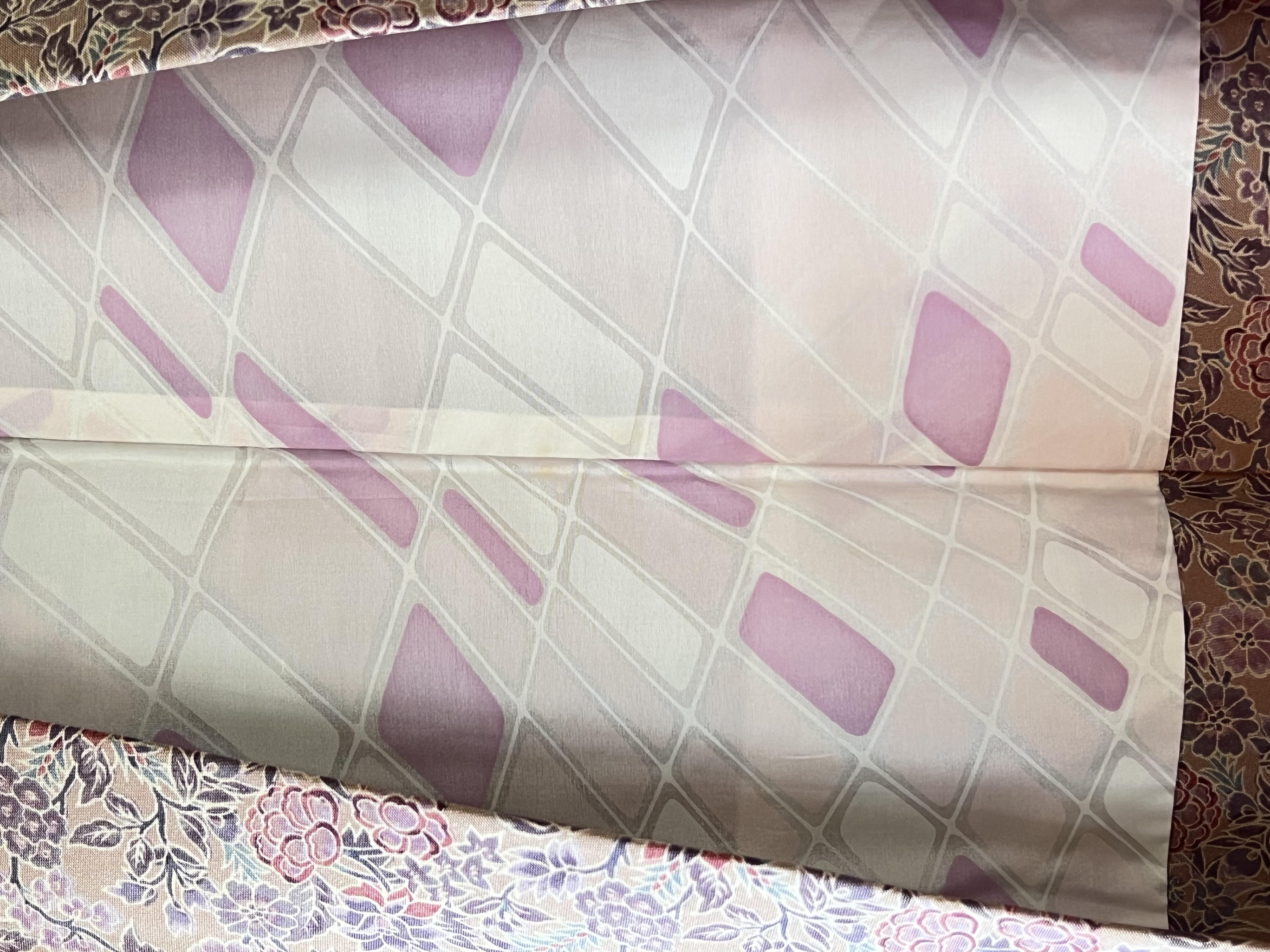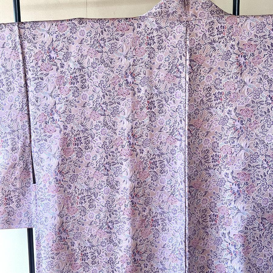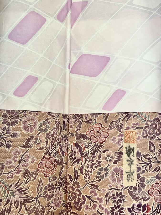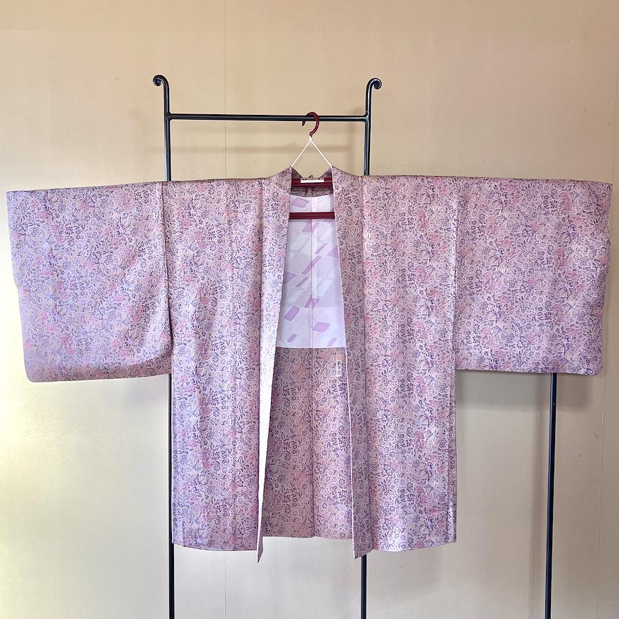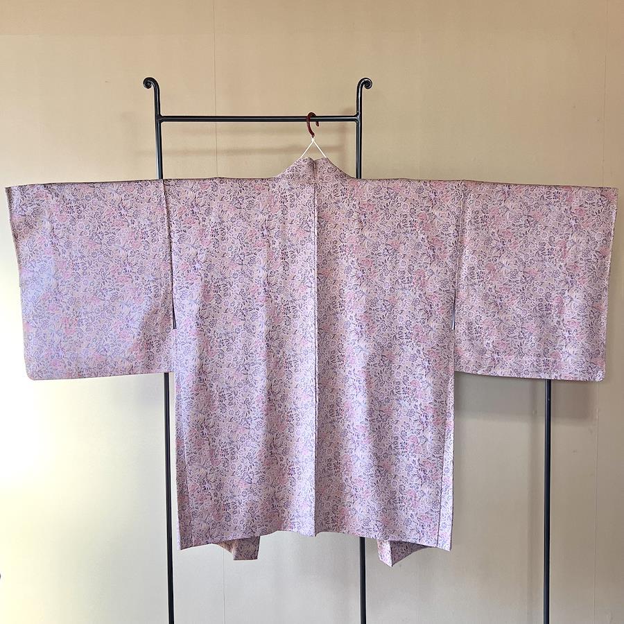 これはヴィンテージの羽織です。こちらは型染めの技法で柄が描かれています。デニムやスカートと合わせてドレスアップも楽しみやすく人気な商品です。