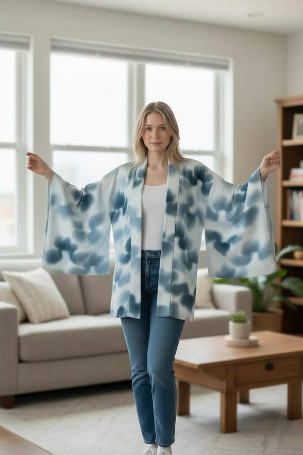 これはヴィンテージの羽織です。こちらは型染めの技法で柄が描かれています。デニムやスカートと合わせてドレスアップも楽しみやすく人気な商品です。