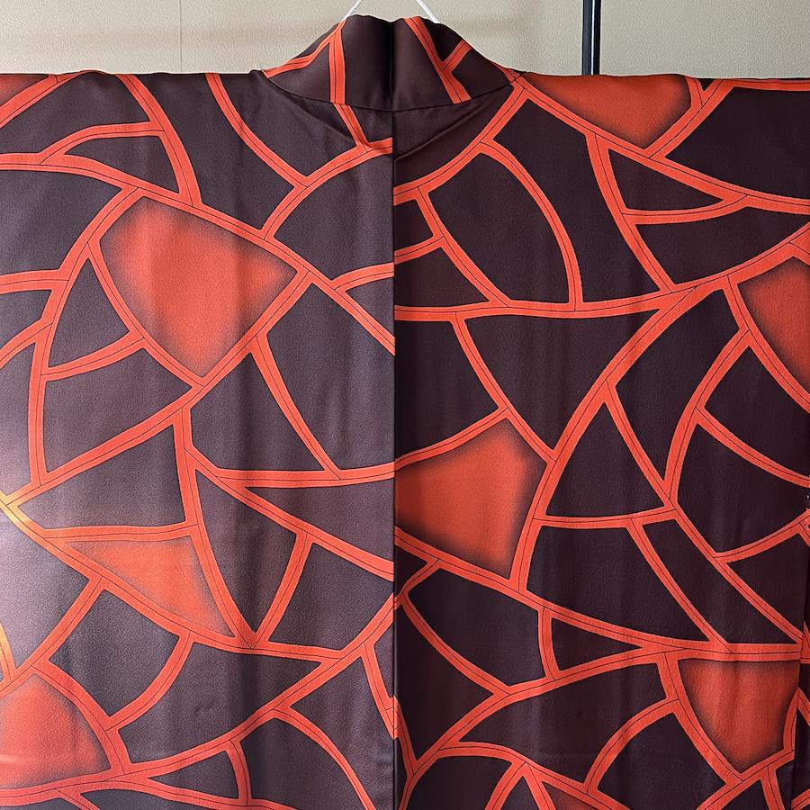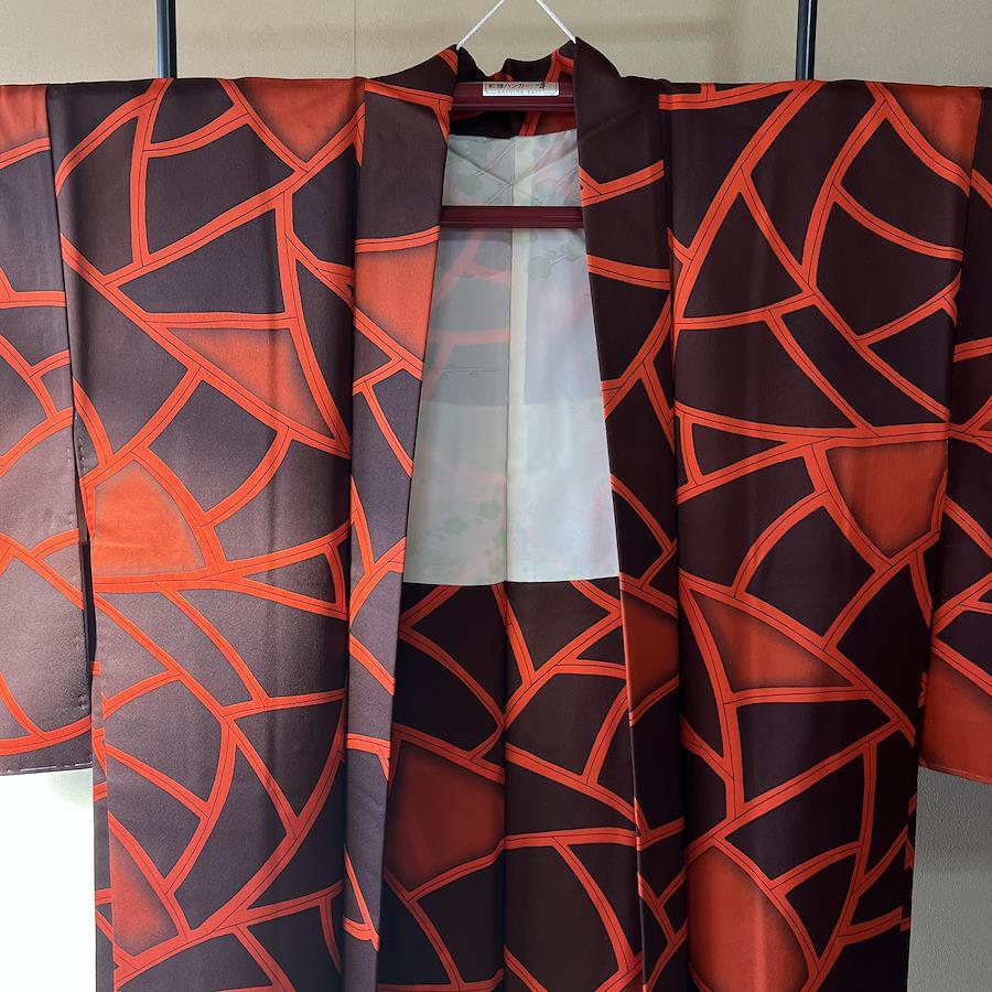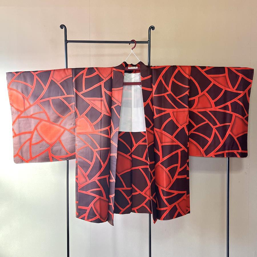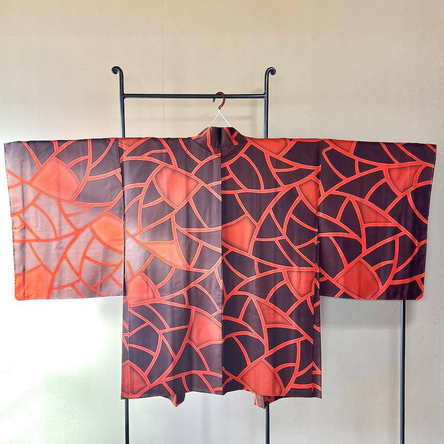これはヴィンテージの羽織です。こちらは型染めの技法で柄が描かれています。デニムやスカートと合わせてドレスアップも楽しみやすく人気な商品です。