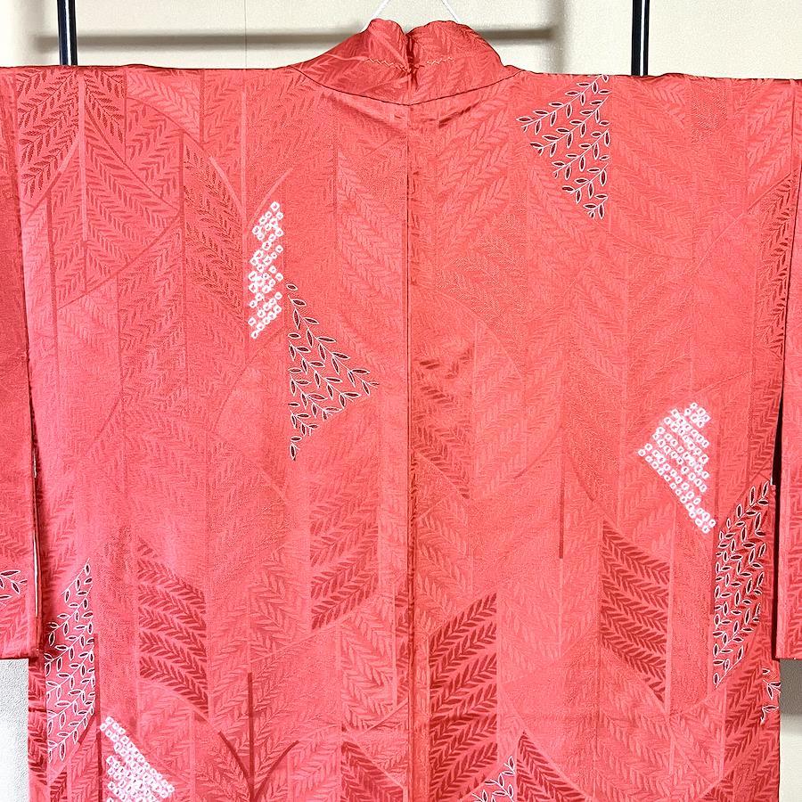 これはヴィンテージの羽織です。こちらは型染めの技法で柄が描かれています。デニムやスカートと合わせてドレスアップも楽しみやすく人気な商品です。