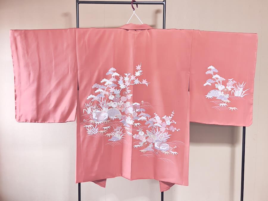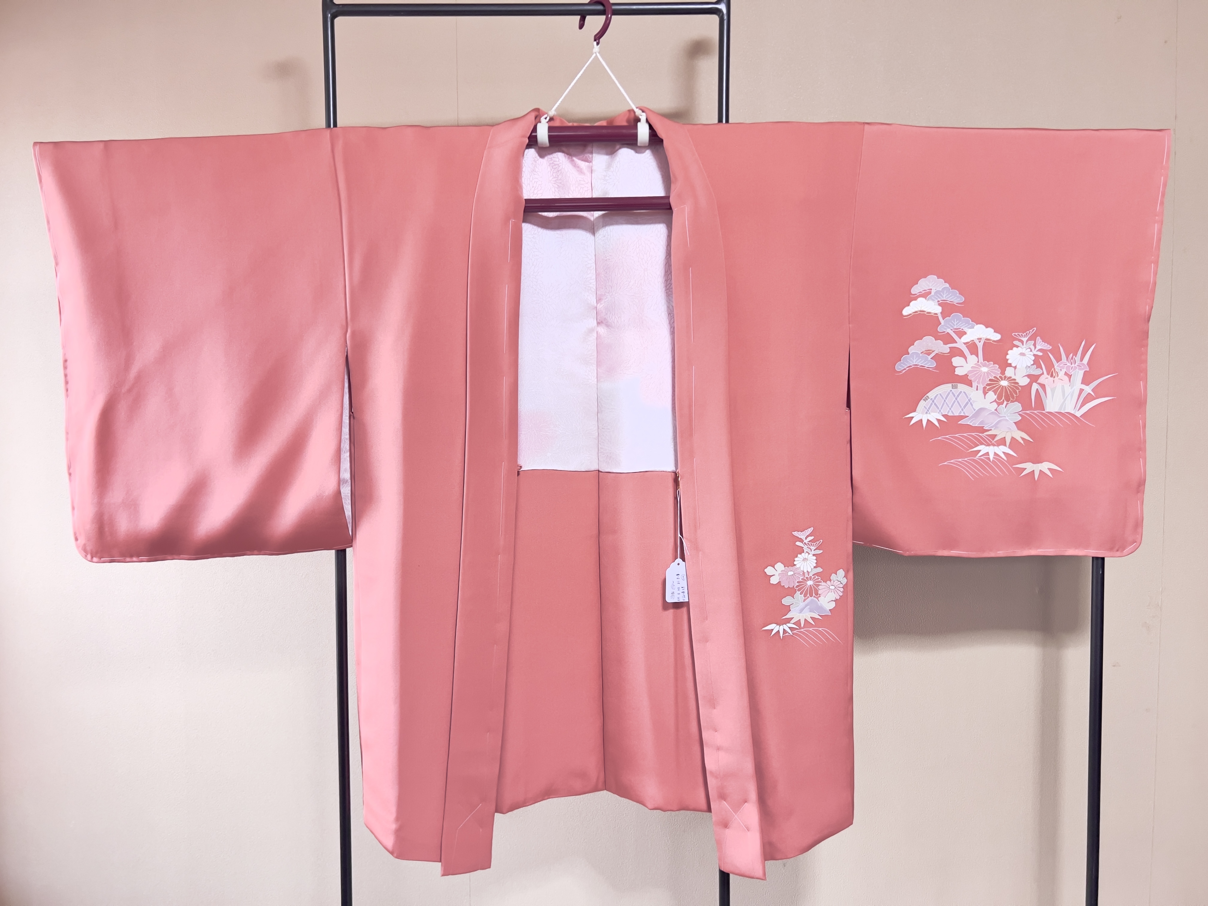 これはヴィンテージの羽織です。こちらは手描きで柄が描かれています。デニムやスカートと合わせてドレスアップも楽しみやすく人気な商品です。