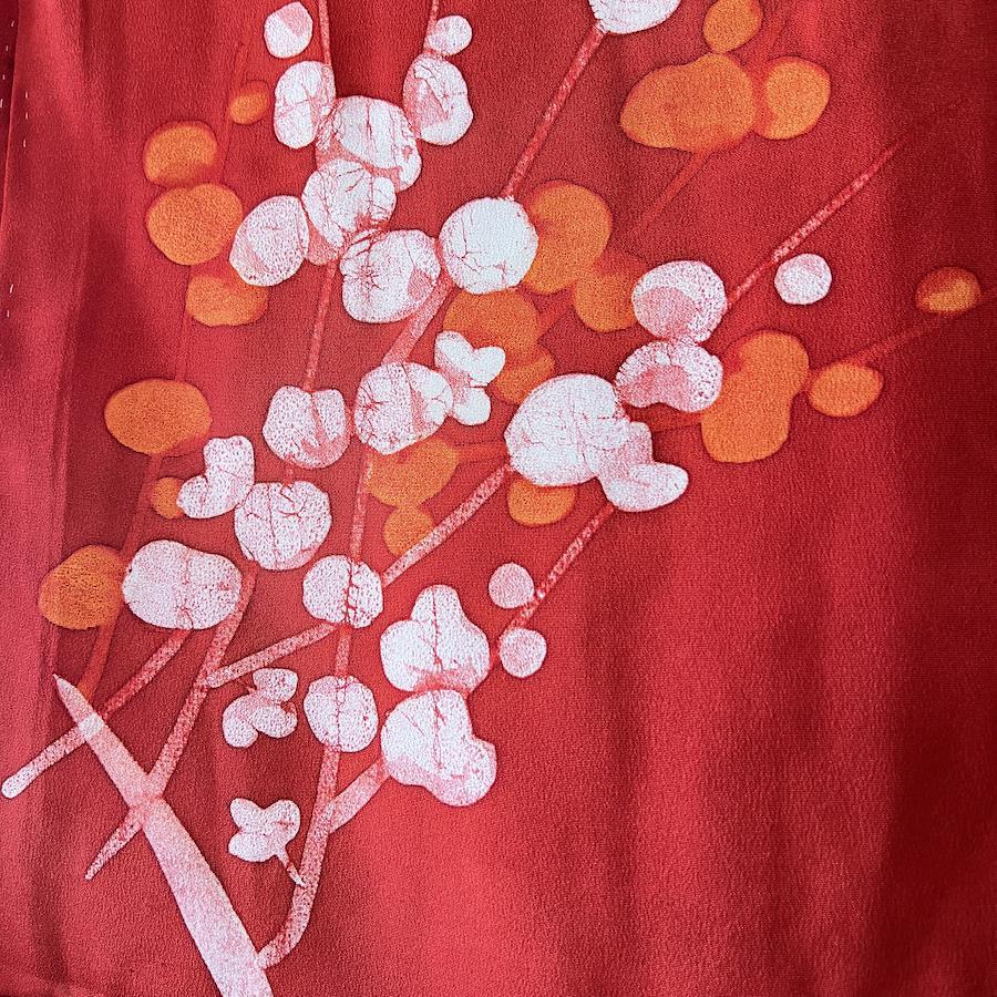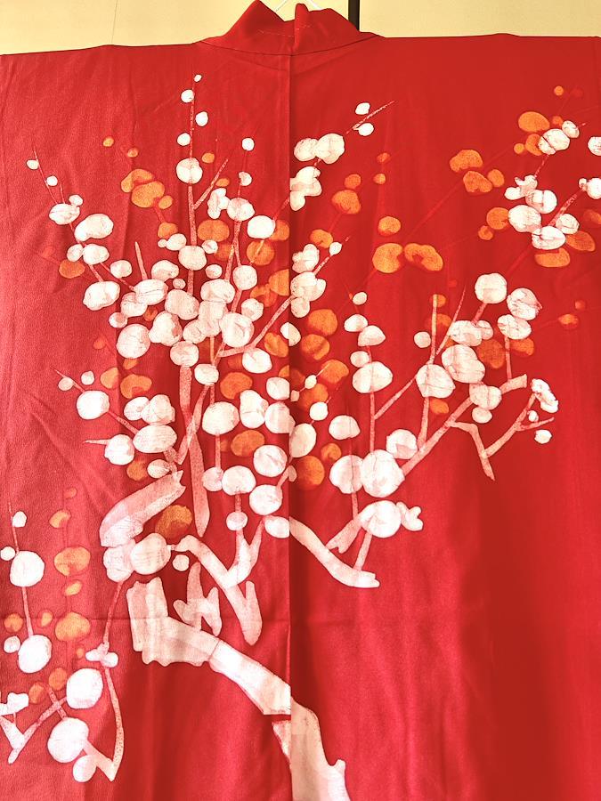 これはヴィンテージの羽織です。こちらは型染めの技法で柄が描かれています。デニムやスカートと合わせてドレスアップも楽しみやすく人気な商品です。
