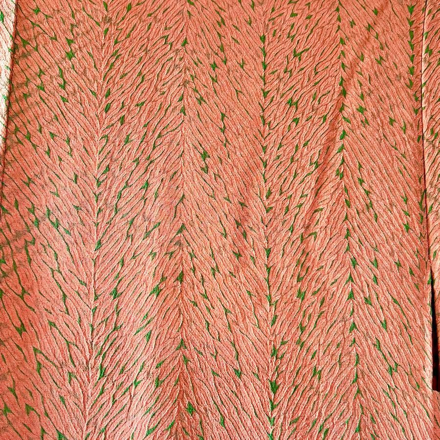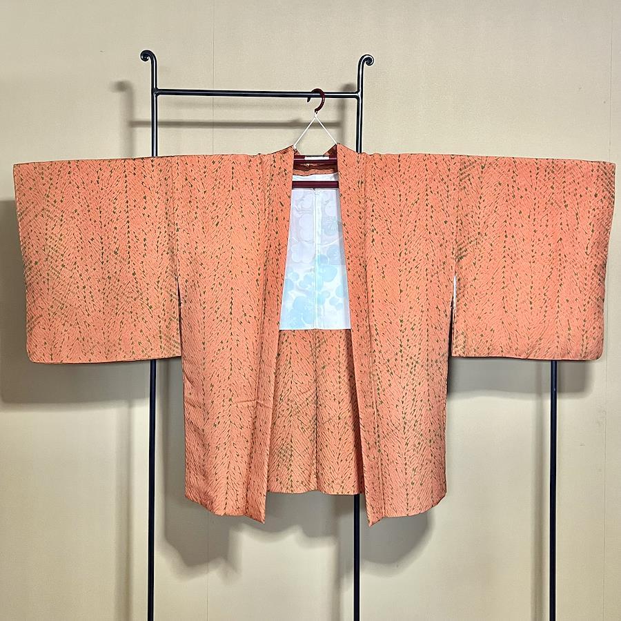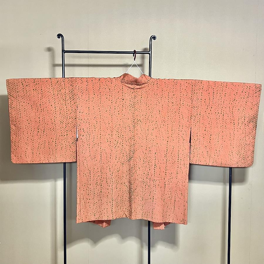 これはヴィンテージの羽織です。こちらは型染めの技法で柄が描かれています。デニムやスカートと合わせてドレスアップも楽しみやすく人気な商品です。