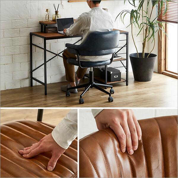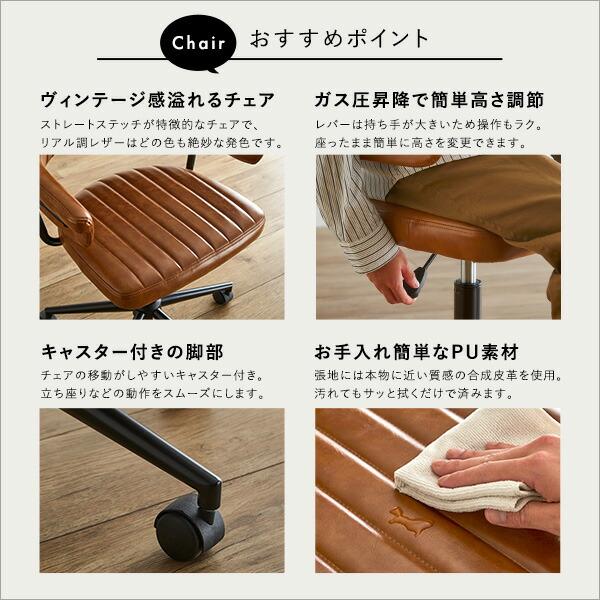 【素材】チェア:(張地)ポリウレタン (脚部)スチール、ナイロンキャスター、粉体塗装テーブル:MDF、スチール【商品サイズ】チェア:W56×D61×H76〜86(SH45〜55)cmテーブル:W110cm×D60cm×H83.5cm【商品重量】チェア:8.3kgテーブル:10kg【梱包サイズ】チェア:W60.5×D56×45.5cmテーブル:112x71.5x6.5cm【梱包重量】チェア:10.6kgテーブル:17kg【カラー】8色(SH-BK,SH-GE,SH-BR,SH-NV,WA-BK,WA-GE,WA-BR,WA-NV)【その他】組み立て時間チェア:30分テーブル:60分張地の色味は生産時期やロットによって若干の誤差はございます。>>ガス圧昇降ヴィンテージデスクチェア(単品)はこちら >>ヴィンテージ風L字パソコンデスク(単品)はこちら