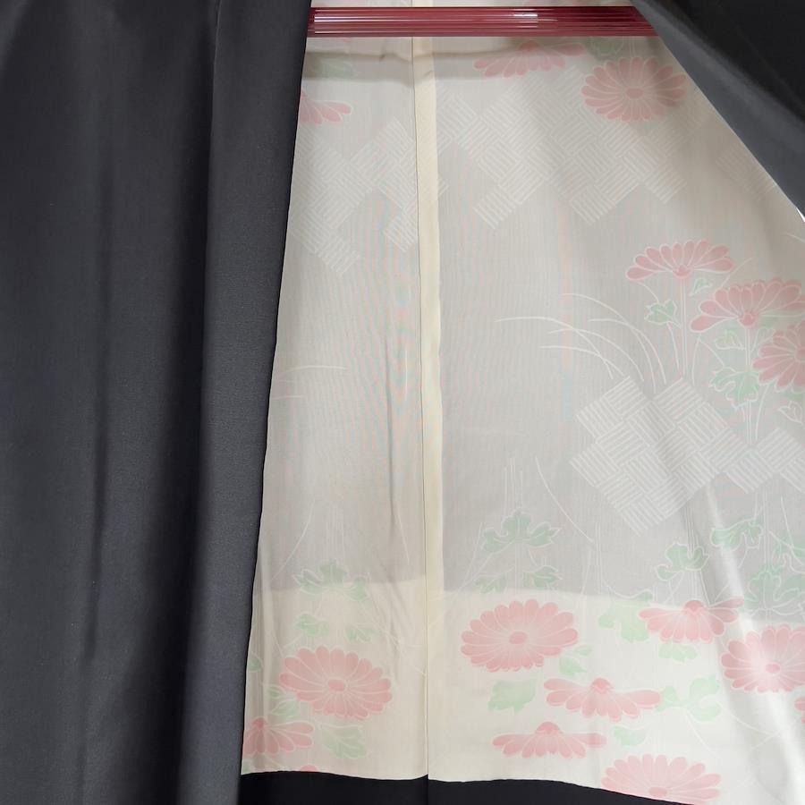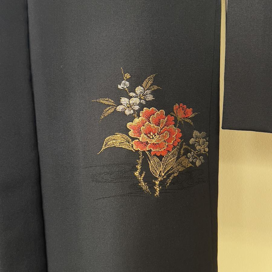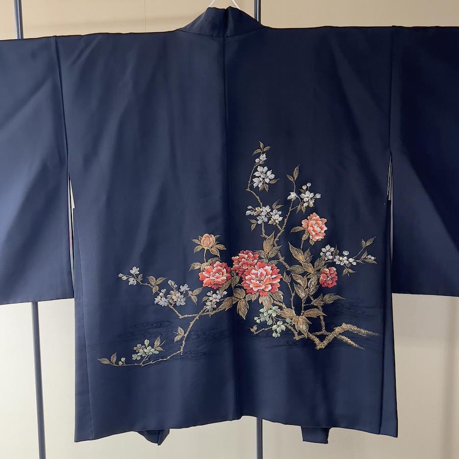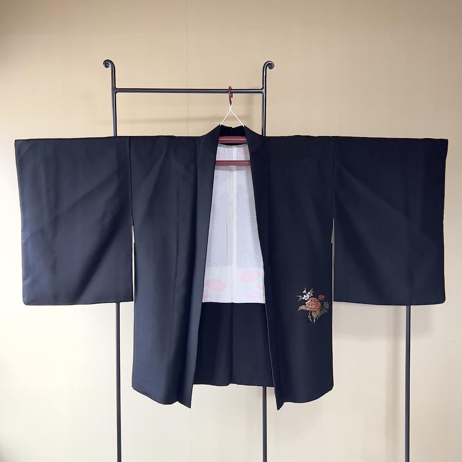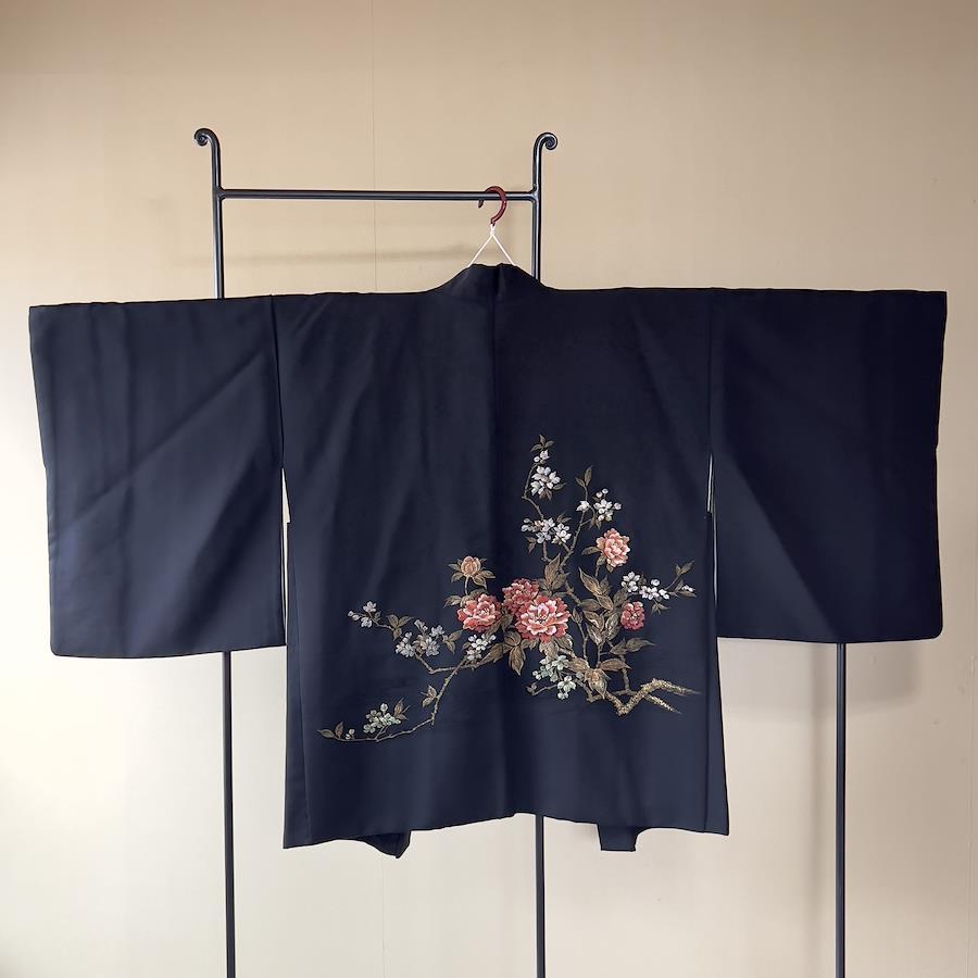 これはヴィンテージの羽織です。こちらは織り出しという技法で生地に色の付いた糸を織って柄が作られています。黒の羽織はデニムやスカートと合わせてドレスアップも楽しみやすく人気な商品です。