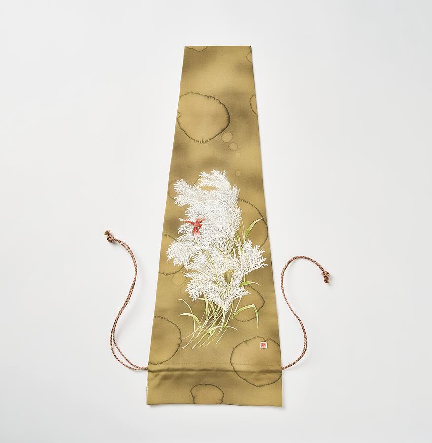 意匠は本作のために木下秀硯氏が、ろうけつ染めの技術を用いて手描きで制作した一点ものです。本作は、秋の野を思わせるすすきと赤とんぼを描いた作品です。夕暮れの空を舞う赤とんぼと、風に揺れるすすきの情景は、日本の秋を象徴する風景として古くから親しまれてきました。静かな秋の気配を感じさせる意匠が、楽器を包む衣として落ち着いた趣を添えます。